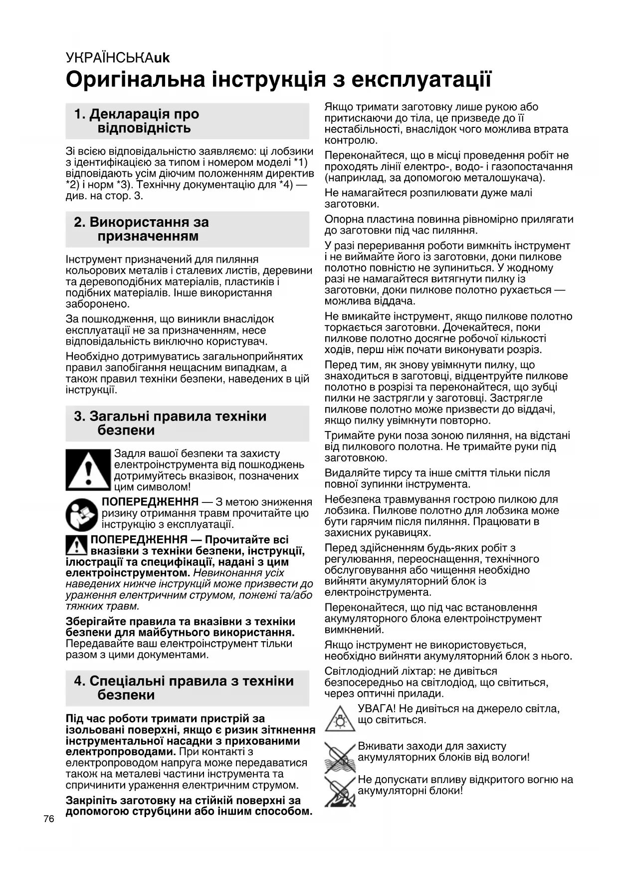 Оригінальна інструкція з експлуатації Зі всією відповідальністю заявляємо: ці лобзики з ідентифікацією за типом і номером моделі *1) відповідають усім діючим положенням директив *2) і норм *3). Технічну документацію для *4) — див. на стор. 3. Інструмент призначений для пиляння кольорових металів і сталевих листів, деревини та деревоподібних матеріалів, пластиків і подібних матеріалів. Інше використання заборонено. За пошкодження, що виникли внаслідок експлуатації не за призначенням, несе відповідальність виключно користувач. Необхідно дотримуватись загальноприйнятих правил запобігання нещасним випадкам, а також правил техніки безпеки, наведених в цій інструкції. Задля вашої безпеки та захисту електроінструмента від пошкоджень дотримуйтесь вказівок, позначених цим символом! ПОПЕРЕДЖЕННЯ — З метою зниження ризику отримання травм прочитайте цю інструкцію з експлуатації. ПОПЕРЕДЖЕННЯ — Прочитайте всі вказівки з техніки безпеки, інструкції, ілюстрації та специфікації, надані з цим електроінструментом. Невиконання усіх наведених нижче інструкцій може призвести до ураження електричним струмом, пожежі та/або тяжких травм. Зберігайте правила та вказівки з техніки безпеки для майбутнього використання. Передавайте ваш електроінструмент тільки разом з цими документами. Під час роботи тримати пристрій за ізольовані поверхні, якщо є ризик зіткнення інструментальної насадки з прихованими електропроводами. При контакті з електропроводом напруга може передаватися також на металеві частини інструмента та спричинити ураження електричним струмом. Закріпіть заготовку на стійкій поверхні за допомогою струбцини або іншим способом. Якщо тримати заготовку лише рукою або притискаючи до тіла, це призведе до її нестабільності, внаслідок чого можлива втрата