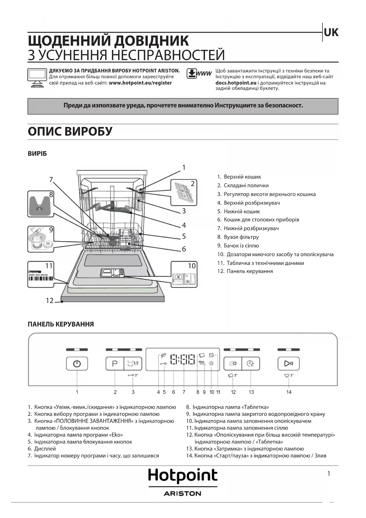 Преди да използвате уреда, прочетете внимателно Инструкциите за безопасност. ДЯКУЄМО ЗА ПРИДБАННЯ ВИРОБУ HOTPOINT ARISTON. Для отримання більш повної допомоги зареєструйте свій прилад на веб-сайті: www.hotpoint.eu/registerЩоб завантажити Інструкції з техніки безпеки та Інструкцію з експлуатації, відвідайте наш веб-сайт docs.hotpoint.eu і дотримуйтеся інструкцій на задній обкладинці буклету. ЩОДЕННИЙ ДОВІДНИК З УСУНЕННЯ НЕСПРАВНОСТЕЙ ПАНЕЛЬ КЕРУВАННЯ ОПИС ВИРОБУ 1. Верхній кошик2. Складані полички3. Регулятор висоти верхнього кошика4. Верхній розбризкувач5. Нижній кошик6. Кошик для столових приборів7. Нижній розбризкувач8. Вузол фільтру9. Бачок із сіллю10. Дозатори миючого засобу та ополіскувача11. Табличка з технічними даними12. Панель керування1. Кнопка «Увімк.-вимк./скидання» з індикаторною лампою2. Кнопка вибору програми з індикаторною лампою3. Кнопка «ПОЛОВИННЕ ЗАВАНТАЖЕННЯ» з індикаторною лампою / Блокування кнопок4. Індикаторна лампа програми «Eko»5. Індикаторна лампа блокування кнопок6. Дисплей7. Індикатор номеру програми і часу, що залишився8. Індикаторна лампа «Таблетка» 9. Індикаторна лампа закритого водопровідного крану10. Індикаторна лампа заповнення ополіскувачем11. Індикаторна лампа заповнення сіллю12. Кнопка «Ополіскування при більш високій температурі» індикаторною лампою / «Таблетка» 13. Кнопка «Затримка» з індикаторною лампою14. Кнопка «Старт/пауза» з індикаторною лампою / Злив0000 000 00000 Service:
