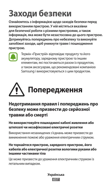 Заходи безпеки Ознайомтесь з інформацією щодо заходів безпеки перед використанням пристрою. У ній містяться вказівки для безпечної роботи з різними пристроями, а також інформація, яка може бути незастосовна до цього пристрою. Дотримуйтесь попереджень про небезпеку та виконуйте запобіжні заходи, щоб уникнути травм і пошкодження Термін «Пристрій» відповідає продукту та його акумулятору, зарядному пристрою та іншим елементам, які постачаються разом із продуктом, а також аксесуарам, що рекомендовані компанією Samsung і використовуються з цим продуктом. Попередження Недотримання правил і попереджень про безпеку може призвести до серйозної травми або смерті Не використовуйте пошкоджені кабелі живлення або штепселі чи незафіксовані електричні розетки Використання незахищених з'єднань може призвести до виникнення пожежі або ураження електричним струмом. Не торкайтеся пристрою, зарядного пристрою, його кабелів або електричної розетки вологими руками або іншими частинами тіла Це може призвести до ураження електричним струмом із летальним випадком.