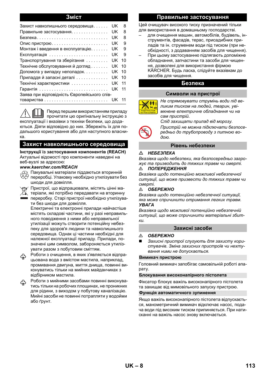 Символи на пристрої Перед першим використанням приладу прочитати цю оригінальну інструкцію з експлуатації і вказівки з техніки безпеки, що додаються. Діяти відповідно до них. Збережіть їх для подальшого користування або для наступного власника. Захист навколишнього середовища Рівень небезпеки Інструкції із застосування компонентів (REACH) Актуальні відомості про компоненти наведені на веб-вузлі за адресою: www.kaercher.com/REACH Пакувальні матеріали піддаються вторинній переробці. Упаковку необхідно утилізувати без шкоди для довкілля. Пристрої, що відпрацювали, містять цінні матеріали, які потрібно передавати на вторинну переробку. Старі пристрої необхідно утилізувати без шкоди для довкілля. Електричні та електронні прилади найчастіше містять складові частини, які у разі неправильного поводження з ними або неправильної утилізації можуть створити потенційну небезпеку для здоров'я людини та навколишнього середовища. Однак ці частини необхідні для належної експлуатації приладу. Прилади, позначені цим символом, забороняється утилізувати разом з побутовим сміттям. Роботи з очищення, в яких з'являється відпрацьована вода з вмістом мастила, наприклад, промивання двигуна, миття днища, повинні виконуватись тільки на мийних майданчиках з відбірником мастила. Роботи з мийними засобами повинні виконуватись тільки на робочих площинах, не проникних для рідини, з виходом у побутову каналізацію. Мийні засоби не повинні потрапляти у водойми
