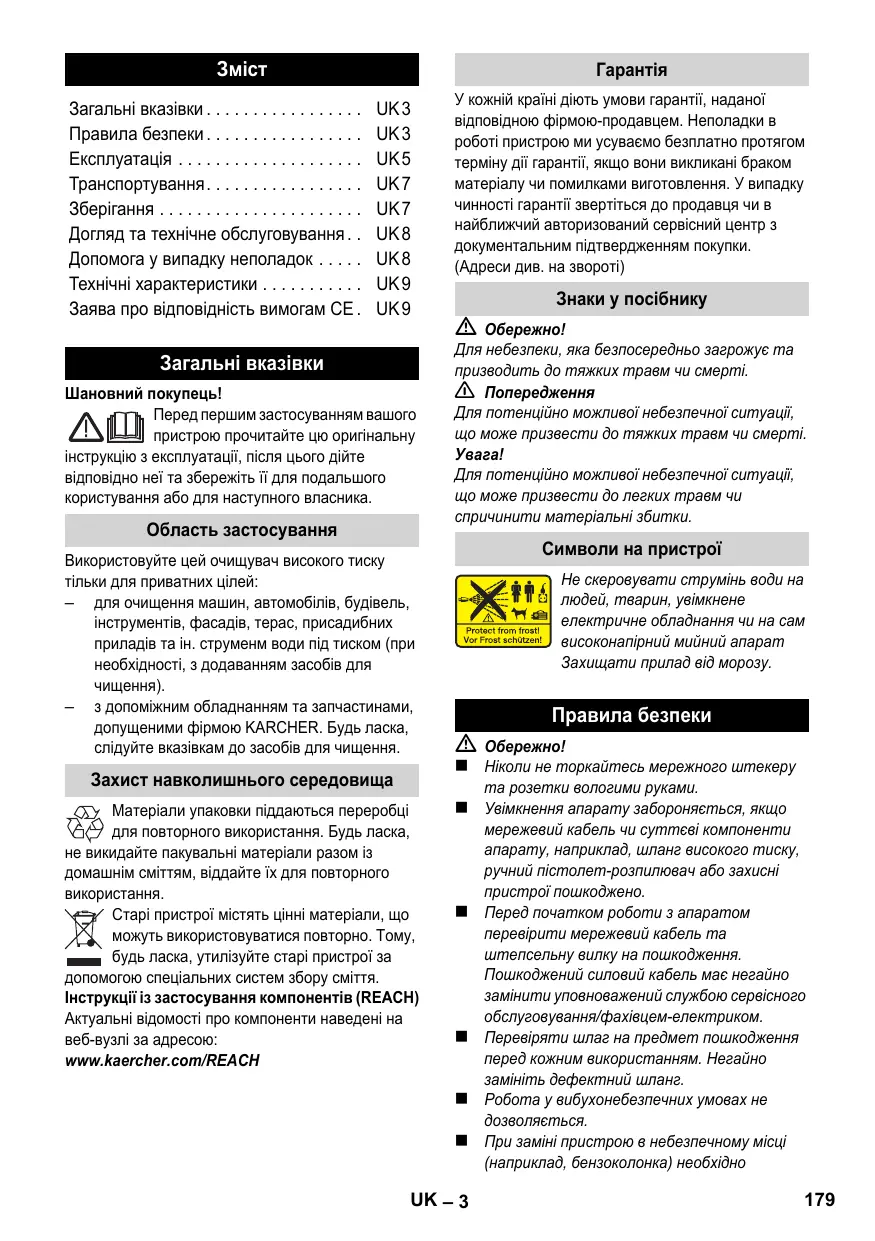 UK 3 UK 3 UK 5 UK 7 UK 7 UK 8 UK 8 UK 9 UK 9 Загальні вказівки Шановний покупець! Перед першим застосуванням вашого пристрою прочитайте цю оригінальну інструкцію з експлуатації, після цього дійте відповідно неї та збережіть її для подальшого користування або для наступного власника. Область застосування Використовуйте цей очищувач високого тиску тільки для приватних цілей: – для очищення машин, автомобілів, будівель, інструментів, фасадів, терас, присадибних приладів та ін. струменм води під тиском (при необхідності, з додаванням засобів для – з допоміжним обладнанням та запчастинами, допущеними фірмою KARCHER. Будь ласка, слідуйте вказівкам до засобів для чищення. Захист навколишнього середовища У кожній країні діють умови гарантії, наданої відповідною фірмою-продавцем. Неполадки в роботі пристрою ми усуваємо безплатно протягом терміну дії гарантії, якщо вони викликані браком матеріалу чи помилками виготовлення. У випадку чинності гарантії звертіться до продавця чи в найближчий авторизований сервісний центр з документальним підтвердженням покупки. (Адреси див. на звороті) Знаки у посібнику