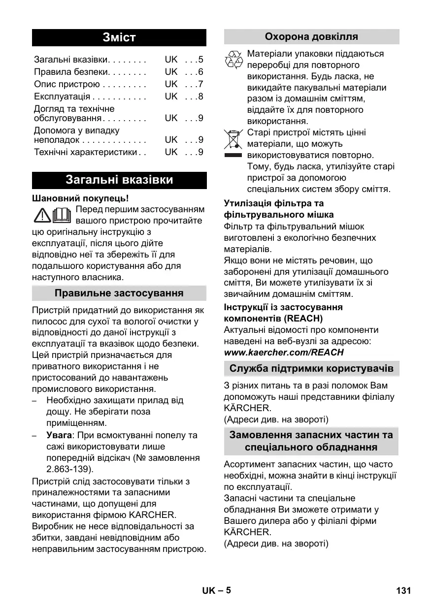 – Protéger l'appareil de la pluie. Ne pas l'entreposer à extérieur. – Attention : en cas d'aspiration de cendre et de suie, utiliser le préséparateur (n° de commande 2.863-139). Seuls des accessoires et des pièces de rechange d’origine autorisés par Kärcher ® doivent être utilisés. Le fabricant décline toute responsabilité en cas de dommages dus à une utilisation non conforme ou incorrecte de l'appareil.
