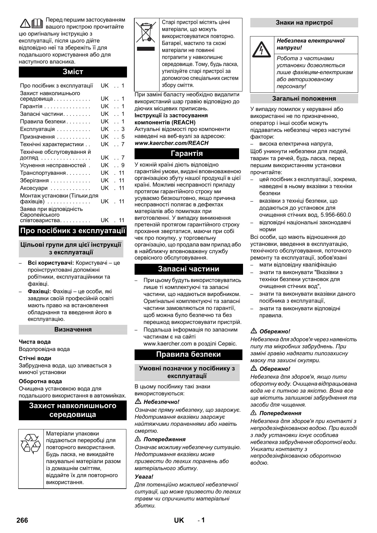 Про посібник з експлуатації Захист навколишнього середовища . . . . . . . . . . . . Гарантія . . . . . . . . . . . . . . . Запасні частини. . . . . . . . . Правила безпеки . . . . . . . . Експлуатація . . . . . . . . . . . Призначення . . . . . . . . . . . Технічні характеристики . . Технічне обслуговування й догляд . . . . . . . . . . . . . . . . Усунення несправностей . Транспортування . . . . . . . . Зберігання . . . . . . . . . . . . . Аксесуари . . . . . . . . . . . . . Монтаж установки (Тільки для фахівців) . . . . . . . . . . . . . . Заява при відповідність Європейського співтовариства. . . . . . . . . . UK . . 1