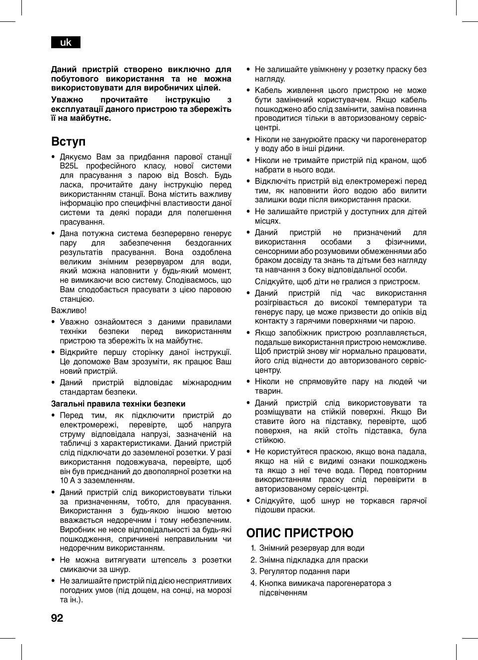 - Дякуємо Вам за придбання парової станції B25L професійного класу, нової системи для прасування з парою від Bosch. Будь ласка, прочитайте дану інструкцію перед використаннямстанції.Вонаміститьважливу інформаціюпроспецифічнівластивостиданої системи та деякі поради для полегшення прасування.