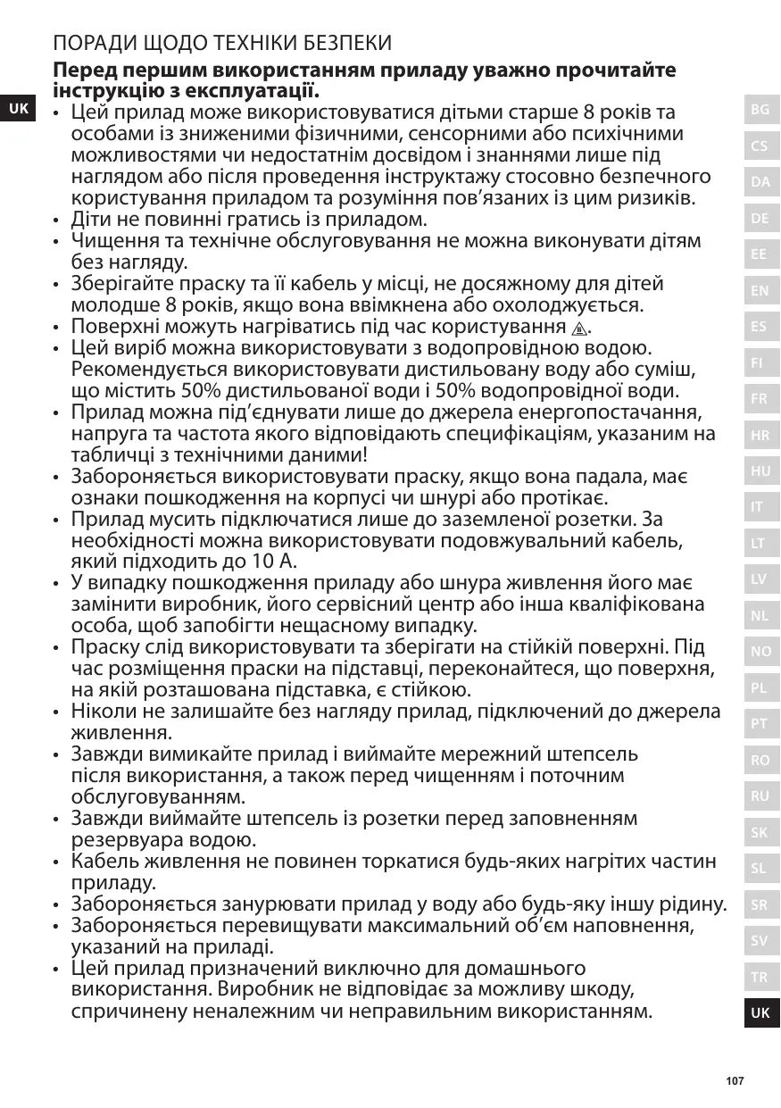 Поради щодо техніки безпеки Перед першим використанням приладу уважно прочитайте інструкцію з експлуатації. • Цей прилад може використовуватися дітьми старше 8 років та особами із зниженими фізичними, сенсорними або психічними можливостями чи недостатнім досвідом і знаннями лише під наглядом або після проведення інструктажу стосовно безпечного користування приладом та розуміння пов’язаних із цим ризиків. • Діти не повинні гратись із приладом. • Чищення та технічне обслуговування не можна виконувати дітям без нагляду. • Зберігайте праску та її кабель у місці, не досяжному для дітей молодше 8 років, якщо вона ввімкнена або охолоджується. • Поверхні можуть нагріватись під час користування . • Цей виріб можна використовувати з водопровідною водою. Рекомендується використовувати дистильовану воду або суміш, що містить 50% дистильованої води і 50% водопровідної води. • Прилад можна під’єднувати лише до джерела енергопостачання, напруга та частота якого відповідають специфікаціям, указаним на табличці з технічними даними! • Забороняється використовувати праску, якщо вона падала, має ознаки пошкодження на корпусі чи шнурі або протікає. • Прилад мусить підключатися лише до заземленої розетки. За необхідності можна використовувати подовжувальний кабель, який підходить до 10 A. • У випадку пошкодження приладу або шнура живлення його має замінити виробник, його сервісний центр або інша кваліфікована особа, щоб запобігти нещасному випадку. • Праску слід використовувати та зберігати на стійкій поверхні. Під час розміщення праски на підставці, переконайтеся, що поверхня, на якій розташована підставка, є стійкою. • Ніколи не залишайте без нагляду прилад, підключений до джерела живлення. • Завжди вимикайте прилад і виймайте мережний штепсель після використання, а також перед чищенням і поточним обслуговуванням. • Завжди виймайте штепсель із розетки перед заповненням резервуара водою. • Кабель живлення не повинен торкатися будь-яких нагрітих частин приладу. • Забороняється занурювати прилад у воду або будь-яку іншу рідину. • Забороняється перевищувати максимальний об’єм наповнення, указаний на приладі. • Цей прилад призначений виключно для домашнього використання. Виробник не відповідає за можливу шкоду, спричинену неналежним чи неправильним використанням. 107