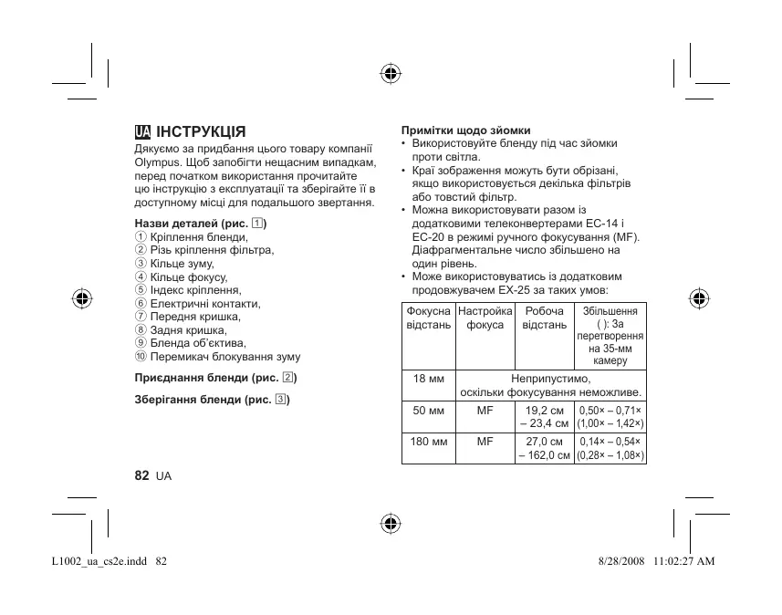 ПОСІБНИК КОРИСТУВАЧА ZUIKO DIGITAL ED 18-180MM F3.5-6.3 OLYMPUS