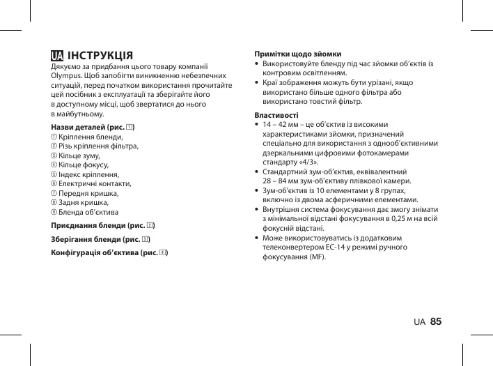 ПОСІБНИК КОРИСТУВАЧА ZUIKO DIGITAL ED 14 OLYMPUS