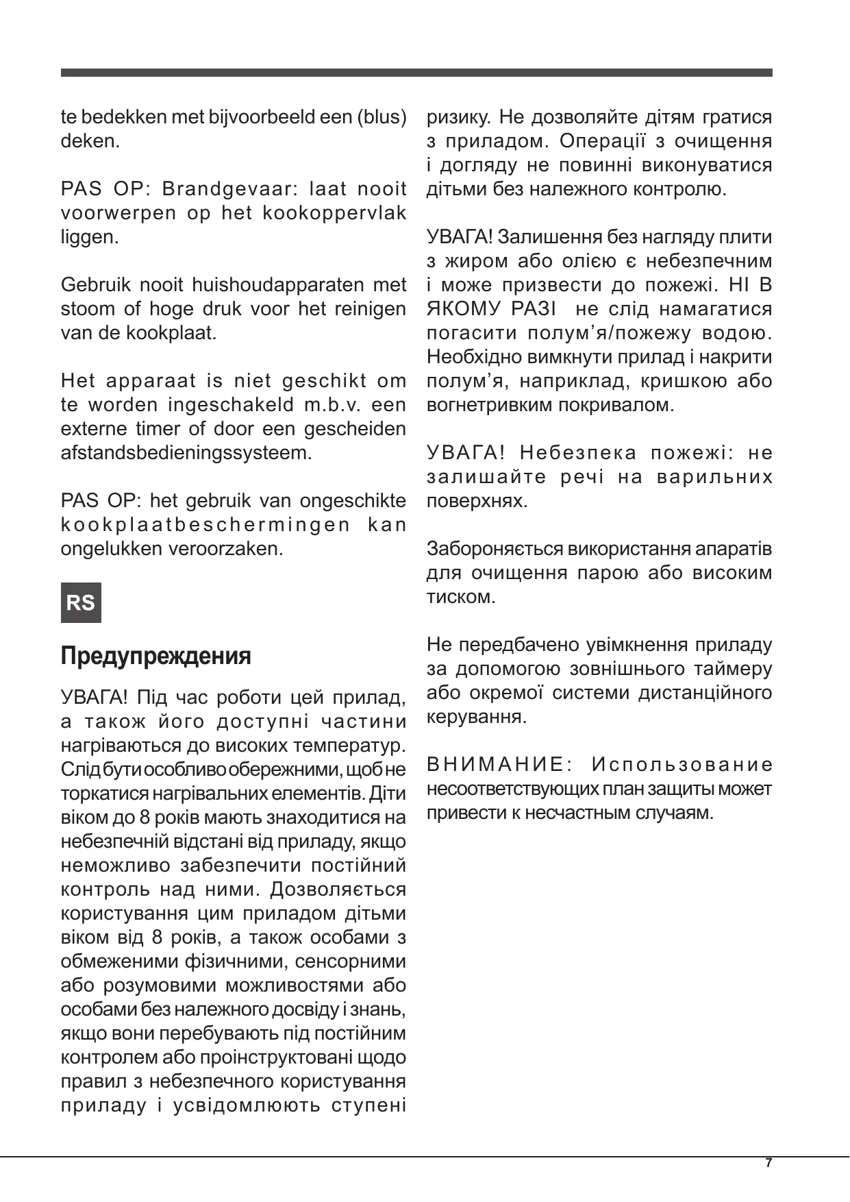 ATTENTION : Cet appareil ainsi que ses parties accessibles deviennent très chauds pendant leur fonctionnement. Il faut faire attention à ne pas toucher les éléments chauffants. Ne pas faire approcher les enfants de moins de 8 ans à moins qu’ils ne soient sous surveillance constante. Le présent appareil peut être utilisé par des enfants de plus de 8 ans et par des personnes présentant des capacités physiques, sensorielles ou mentales réduites ou n’ayant pas l’expérience ou les connaissances indispensables, à condition qu’ils soient sous bonne surveillance ou qu’ils aient reçu les instructions nécessaires pour une utilisation de l’appareil en toute sécurité et à condition qu’ils se rendent compte des dangers encourus. Les enfants ne doivent pas jouer avec l’appareil. Les opérations de nettoyage et d’entretien ne doivent pas être effectuées par des enfants non surveillés. ATTENTION : Laisser un récipient de cuisson avec de l’huile ou de la graisse sur un foyer est dangereux et risque d’entraîner un incendie. Il ne faut JAMAIS essayer d’éteindre une flamme ou un incendie avec de l’eau ! Il faut éteindre l’appareil et couvrir la flamme 4