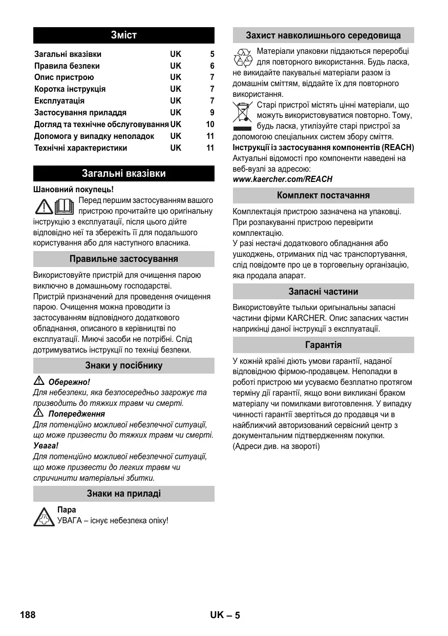 Для небезпеки, яка безпосередньо загрожує та призводить до тяжких травм чи смерті. 몇 Попередження Для потенційно можливої небезпечної ситуації, що може призвести до тяжких травм чи смерті. Для потенційно можливої небезпечної ситуації, що може призвести до легких травм чи спричинити матеріальні збитки. Матеріали упаковки піддаються переробці для повторного використання. Будь ласка, не викидайте пакувальні матеріали разом із домашнім сміттям, віддайте їх для повторного використання. Старі пристрої містять цінні матеріали, що можуть використовуватися повторно. Тому, будь ласка, утилізуйте старі пристрої за допомогою спеціальних систем збору сміття. Інструкції із застосування компонентів (REACH) Актуальні відомості про компоненти наведені на веб-вузлі за адресою: www.kaercher.com/REACH Комплект постачання Комплектація пристрою зазначена на упаковці. При розпакуванні пристрою перевірити комплектацію. У разі нестачі додаткового обладнання або ушкоджень, отриманих під час транспортування, слід повідомте про це в торговельну організацію, яка продала апарат. Запасні частини Використовуйте тыльки оригынальны запасні частини фірми KARCHER. Опис запасних частин наприкінці даної інструкції з експлуатації.