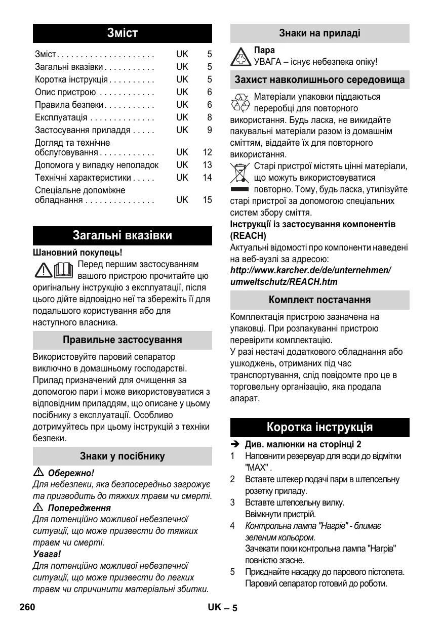 УВАГА – існує небезпека опіку! Захист навколишнього середовища Матеріали упаковки піддаються переробці для повторного використання. Будь ласка, не викидайте пакувальні матеріали разом із домашнім сміттям, віддайте їх для повторного використання. Старі пристрої містять цінні матеріали, що можуть використовуватися повторно. Тому, будь ласка, утилізуйте старі пристрої за допомогою спеціальних систем збору сміття. Інструкції із застосування компонентів (REACH) Актуальні відомості про компоненти наведені на веб-вузлі за адресою: http://www.karcher.de/de/unternehmen/ umweltschutz/REACH.htm Комплект постачання Комплектація пристрою зазначена на упаковці. При розпакуванні пристрою перевірити комплектацію. У разі нестачі додаткового обладнання або ушкоджень, отриманих під час транспортування, слід повідомте про це в торговельну організацію, яка продала