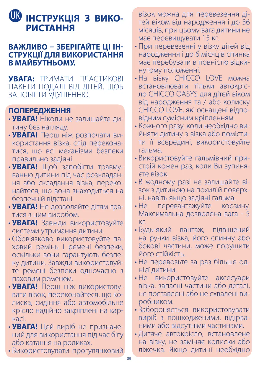 візок можна для перевезення дітей віком від народження і до 36 місяців, при цьому вага дитини не має перевищувати 15 кг. rɲʢʚʡʗʢʗʓʗʙʗʟʟʷʥʓʷʙʜʥʖʷʤʗʛʓʷʖ народження і до 6 місяців спинка має перебувати в повністю відкинутому положенні. rɰʑ ʓʷʙʜʥ $)*$$0 -07& ʞʠʘʟʑ встановлювати тільки автокрісло CHICCO OASYS для дітей віком від народження та / або колиску CHICCO LOVE, які оснащені відповідним сумісним кріпленням. rɭʠʘʟʠʔʠʢʑʙʥ ʜʠʝʚʟʗʠʒʧʷʖʟʠʓʚйняти дитину з візка або помістити її всередині, використовуйте гальма. rɤʚʜʠʢʚʣʤʠʓʥʛʤʗ ʔʑʝʮʞʷʓʟʚʛ ʡʢʚстрій кожен раз, коли Ви зупиняєте візок. rɤ ʘʠʖʟʠʞʥ ʢʑʙʷ ʟʗ ʙʑʝʚʪʑʛʤʗ ʓʷзок з дитиною на похилій поверхні, навіть якщо задіяні гальма. rɰʗ ʡʗʢʗʓʑʟʤʑʘʥʛʤʗ ʜʠʢʙʚʟʥ Максимальна дозволена вага - 5 кг. rɣʥʖʮʱʜʚʛ ʓʑʟʤʑʘ ʡʷʖʓʷʪʗʟʚʛ на ручки візка, його спинну або бокові частини, може порушити його стійкість. rɰʗ ʡʗʢʗʓʠʙʮʤʗ ʙʑ ʢʑʙ ʒʷʝʮʪʗ ʠʖнієї дитини. rɰʗ ʓʚʜʠʢʚʣʤʠʓʥʛʤʗ ʑʜʣʗʣʥʑʢʚ візка, запасні частини або деталі, не поставлені або не схвалені виробником. rɪʑʒʠʢʠʟʱʵʤʮʣʱ ʓʚʜʠʢʚʣʤʠʓʥʓʑʤʚ виріб з пошкодженими, відірваними або відсутніми частинами. rɧʚʤʱʩʗ ʑʓʤʠʜʢʷʣʝʠ ʓʣʤʑʟʠʓʝʗʟʗ на візку, не заміняє колиски або ліжечка. Якщо дитині необхідно