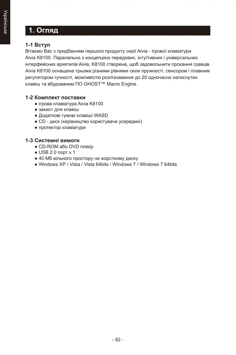 1-1 Вступ Вітаємо Вас з придбанням першого продукту серії Aivia - ігрової клавіатури Aivia K8100. Паралельно з концепцією передових, інтуїтивних і універсальних інтерфейсних архетипів Aivia, K8100 створена, щоб задовольнити прохання гравців. Aivia K8100 оснащена трьома різними рівнями сили пружності, сенсором і плавним регулятором гучності, можливістю розпізнавання до 20 одночасно натиснутих клавіш та вбудованим ПО GHOST™ Macro Engine. 1-2 Комплект поставки ● ігрова клавіатура Aivia K8100 ● захист для клавіш ● Додаткові гумові клавіші WASD ● CD - диск (керівництво користувача усередині) ● протектор клавіатури 1-3 Системні вимоги ● CD-ROM або DVD плеєр ● USB 2.0 порт x 1 ● 40 Мб вільного простору на жорсткому диску ● Windows XP / Vista / Vista 64bits / Windows 7 / Windows 7 64bits