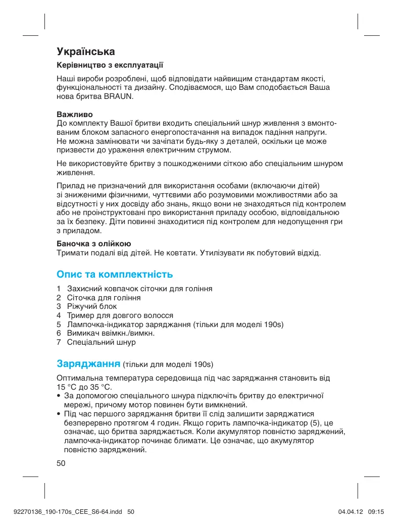 ì͇ªÌҸ͇ Керівництво з експлуатації Наші вироби розроблені, щоб відповідати найвищим стандартам якості, функціональності та дизайну. Сподіваємося, що Вам сподобається Ваша нова бритва BRAUN. До комплекту Вашої бритви входить спеціальний шнур живлення з вмонтованим блоком запасного енергопостачання на випадок падіння напруги. Не можна замінювати чи зачіпати будь-яку з деталей, оскільки це може призвести до ураження електричним струмом. Не використовуйте бритву з пошкодженими сіткою або спеціальним шнуром Прилад не призначений для використання особами (включаючи дітей) зі зниженими фізичними, чуттєвими або розумовими можливостями або за відсутності у них досвіду або знань, якщо вони не знаходяться під контролем або не проінструктовані про використання приладу особою, відповідальною за їх безпеку. Діти повинні знаходитися під контролем для недопущення гри з приладом. Баночка з олійкою Тримати подалі від дітей. Не ковтати. Утилізувати як побутовий відхід. Опис та комплектність