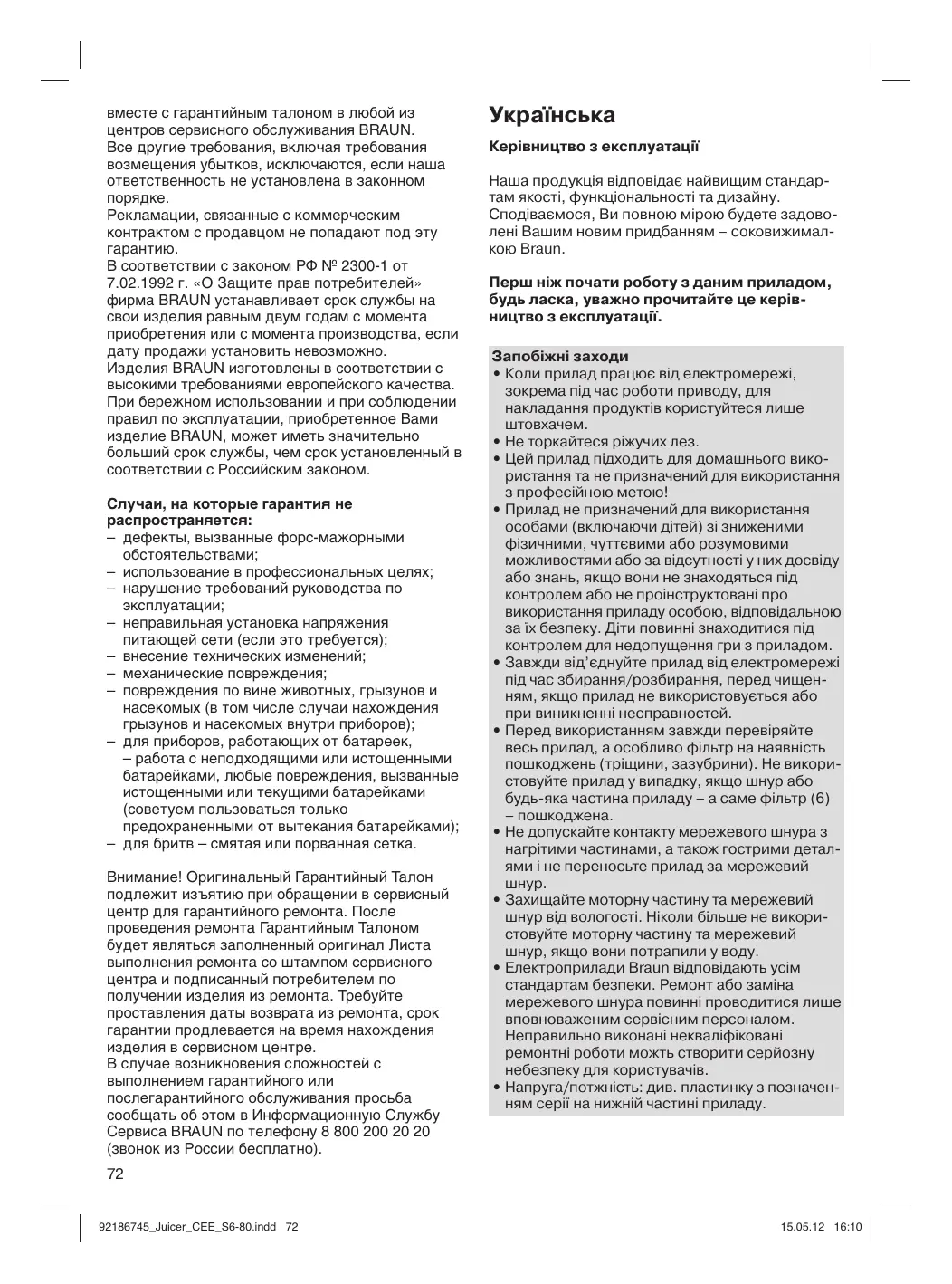 Українська Керівництво з експлуатації Наша продукція відповідає найвищим стандартам якості, функціональності та дизайну. Сподіваємося, Ви повною мірою будете задоволені Вашим новим придбанням – соковижималкою Braun. Перш ніж почати роботу з даним приладом, будь ласка, уважно прочитайте це керівництво з експлуатації. Запобіжні заходи • Коли прилад працює від електромережі, зокрема під час роботи приводу, для накладання продуктів користуйтеся лише штовхачем. • Не торкайтеся ріжучих лез. • Цей прилад підходить для домашнього використання та не призначений для використання з професійною метою! • Прилад не призначений для використання особами (включаючи дітей) зі зниженими фізичними, чуттєвими або розумовими можливостями або за відсутності у них досвіду або знань, якщо вони не знаходяться під контролем або не проінструктовані про використання приладу особою, відповідальною за їх безпеку. Діти повинні знаходитися під контролем для недопущення гри з приладом. • Завжди від’єднуйте прилад від електромережі під час збирання/розбирання, перед чищенням, якщо прилад не використовується або при виникненні несправностей. • Перед використанням завжди перевіряйте весь прилад, а особливо фільтр на наявність пошкоджень (тріщини, зазубрини). Не використовуйте прилад у випадку, якщо шнур або будь-яка частина приладу – а саме фільтр (6) – пошкоджена. • Не допускайте контакту мережевого шнура з нагрітими частинами, а також гострими деталями і не переносьте прилад за мережевий шнур. • Захищайте моторну частину та мережевий шнур від вологості. Ніколи більше не використовуйте моторну частину та мережевий шнур, якщо вони потрапили у воду. • Електроприлади Braun відповідають усім стандартам безпеки. Ремонт або заміна мережевого шнура повинні проводитися лише вповноваженим сервісним персоналом. Неправильно виконані некваліфіковані ремонтні роботи можть створити серйозну небезпеку для користувачів. • Напруга/потжність: див. пластинку з позначенням серії на нижній частині приладу.