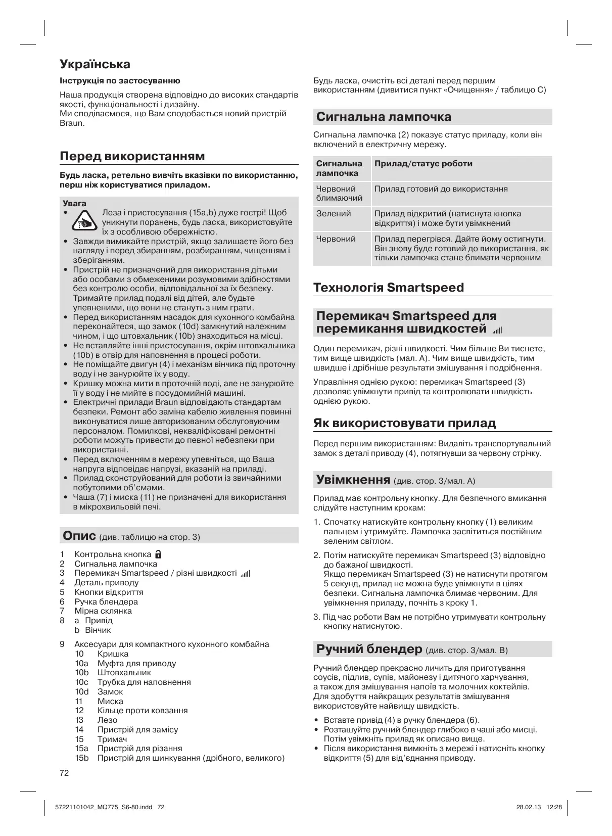 Леза і пристосування (15a,b) дуже гострі! Щоб уникнути поранень, будь ласка, використовуйте їх з особливою обережністю. Завжди вимикайте пристрій, якщо залишаєте його без нагляду і перед збиранням, розбиранням, чищенням і зберіганням. Пристрій не призначений для використання дітьми або особами з обмеженими розумовими здібностями без контролю особи, відповідальної за їх безпеку. Тримайте прилад подалі від дітей, але будьте упевненими, що вони не стануть з ним грати. Перед використанням насадок для кухонного комбайна переконайтеся, що замок (10d) замкнутий належним чином, і що штовхальник (10b) знаходиться на місці. Не вставляйте інші пристосування, окрім штовхальника (10b) в отвір для наповнення в процесі роботи. Не поміщайте двигун (4) і механізм вінчика під проточну воду і не занурюйте їх у воду. Кришку можна мити в проточній воді, але не занурюйте її у воду і не мийте в посудомийній машині. Електричні прилади Braun відповідають стандартам безпеки. Ремонт або заміна кабелю живлення повинні виконуватися лише авторизованим обслуговуючим персоналом. Помилкові, некваліфіковані ремонтні роботи можуть привести до певної небезпеки при використанні. Перед включенням в мережу упевніться, що Ваша напруга відповідає напрузі, вказаній на приладі. Прилад сконструйований для роботи із звичайними побутовими об’ємами. Чаша (7) і миска (11) не призначені для використання в мікрохвильовій печі. Опис (див. таблицю на стор. 3)