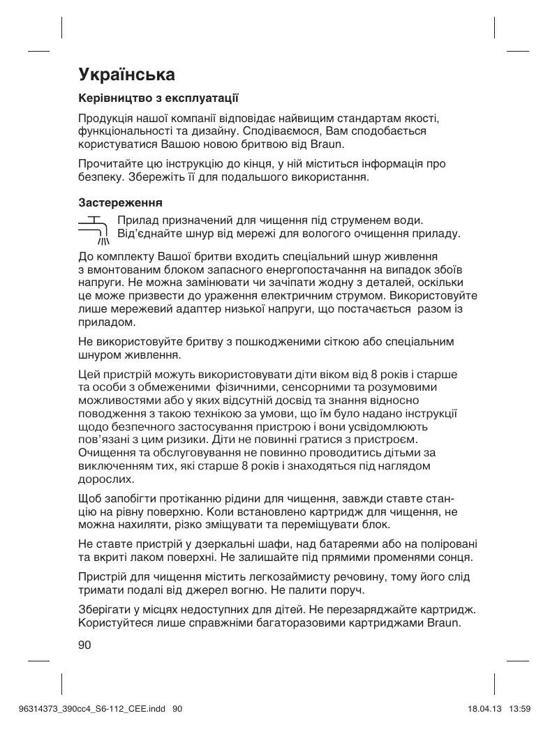 ì͇ªÌҸ͇ Керівництво з експлуатації Продукція нашої компанії відповідає найвищим стандартам якості, функціональності та дизайну. Сподіваємося, Вам сподобається користуватися Вашою новою бритвою від Braun. Прочитайте цю інструкцію до кінця, у ній міститься інформація про безпеку. Збережіть її для подальшого використання. Застереження Прилад призначений для чищення під струменем води. Від’єднайте шнур від мережі для вологого очищення приладу. До комплекту Вашої бритви входить спеціальний шнур живлення з вмонтованим блоком запасного енергопостачання на випадок збоїв напруги. Не можна замінювати чи зачіпати жодну з деталей, оскільки це може призвести до ураження електричним струмом. Використовуйте лише мережевий адаптер низької напруги, що постачається разом із Не використовуйте бритву з пошкодженими сіткою або спеціальним шнуром живлення. Цей пристрій можуть використовувати діти віком від 8 років і старше та особи з обмеженими фізичними, сенсорними та розумовими можливостями або у яких відсутній досвід та знання відносно поводження з такою технікою за умови, що їм було надано інструкції щодо безпечного застосування пристрою і вони усвідомлюють пов’язані з цим ризики. Діти не повинні гратися з пристроєм. Очищення та обслуговування не повинно проводитись дітьми за виключенням тих, які старше 8 років і знаходяться під наглядом Щоб запобігти протіканню рідини для чищення, завжди ставте станцію на рівну поверхню. Коли встановлено картридж для чищення, не можна нахиляти, різко зміщувати та переміщувати блок. Не ставте пристрій у дзеркальні шафи, над батареями або на поліровані та вкриті лаком поверхні. Не залишайте під прямими променями сонця. Пристрій для чищення містить легкозаймисту речовину, тому його слід тримати подалі від джерел вогню. Не палити поруч. Зберігати у місцях недоступних для дітей. Не перезаряджайте картридж. Користуйтеся лише справжніми багаторазовими картриджами Braun.