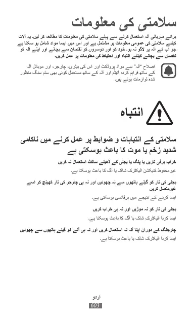 Le non-respect des consignes de sécurité peut entraîner des blessures graves, voire la mort N’utilisez pas de prises et de cordons d’alimentation endommagé(e)s ou de prises électriques mal fixées Les branchements non sécurisés engendrent un risque d’électrocution ou d’incendie. Ne touchez pas le cordon d’alimentation avec les mains mouillées et ne déconnectez pas le chargeur en tirant sur le cordon Vous risquez de vous électrocuter. Ne tordez et n’endommagez pas le cordon d’alimentation Vous risquez de vous électrocuter ou de provoquer un incendie. N’utilisez pas l’appareil avec les mains mouillées ou lorsque celui-ci est en cours de chargement Vous risquez de vous électrocuter.