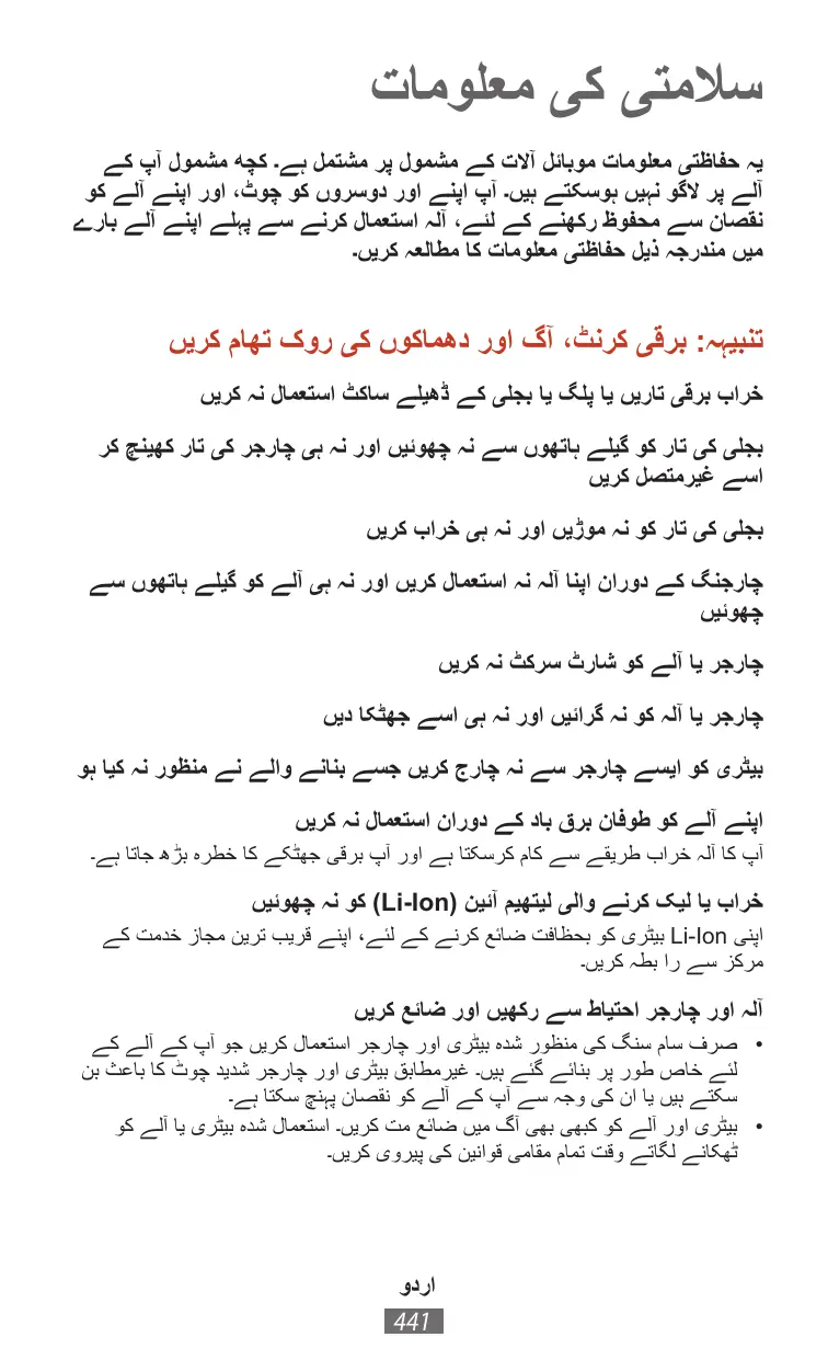 خراب یا لیک کرنے والی لیتھیم آئین ( )Li-Ionکو نہ چھوئيں اپنی Li-Ionبیٹری کو بحظافت ضائع کرنے کے لئے ،اپنے قریب ترین مجاز خدمت کے مرکز سے را بطہ کریں۔