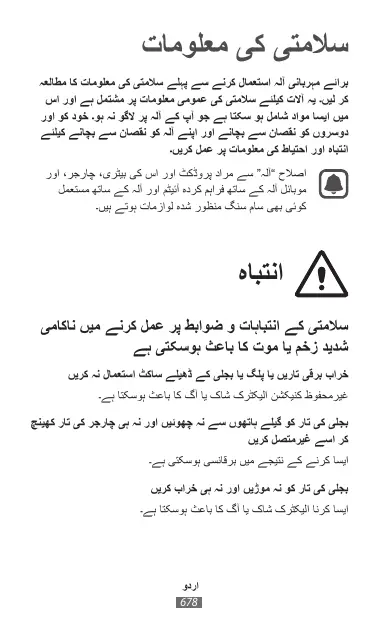 سالمتی کی معلومات برائے مہربانی آلہ استعمال کرنے سے پہلے سالمتی کی معلومات کا مطالعہ کر لیں۔ یہ آالت کیلئے سالمتی کی عمومی معلومات پر مشتمل ہے اور اس میں ایسا مواد شامل ہو سکتا ہے جو آپ کے آلہ پر الگو نہ ہو۔ خود کو اور دوسروں کو نقصان سے بچانے اور اپنے آلہ کو نقصان سے بچانے کیلئے انتباہ اور احتیاط کی معلومات پر عمل کریں۔ اصالح ”آلہ“ سے مراد پروڈکٹ اور اس کی بیٹری ،چارجر ،اور موبائل آلہ کے ساتھ فراہم کردہ آئیٹم اور آلہ کے ساتھ مستعمل کوئی بھی سام سنگ منظور شدہ لوازمات ہوتے ہیں۔