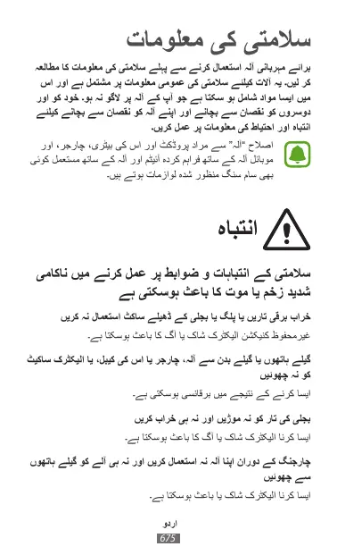 برائے مہربانی آلہ استعمال کرنے سے پہلے سالمتی کی معلومات کا مطالعہ کر لیں۔ یہ آالت کیلئے سالمتی کی عمومی معلومات پر مشتمل ہے اور اس میں ایسا مواد شامل ہو سکتا ہے جو آپ کے آلہ پر الگو نہ ہو۔ خود کو اور دوسروں کو نقصان سے بچانے اور اپنے آلہ کو نقصان سے بچانے کیلئے انتباہ اور احتیاط کی معلومات پر عمل کریں۔ اصالح ”آلہ“ سے مراد پروڈکٹ اور اس کی بیٹری ،چارجر ،اور موبائل آلہ کے ساتھ فراہم کردہ آئیٹم اور آلہ کے ساتھ مستعمل کوئی بھی سام سنگ منظور شدہ لوازمات ہوتے ہیں۔