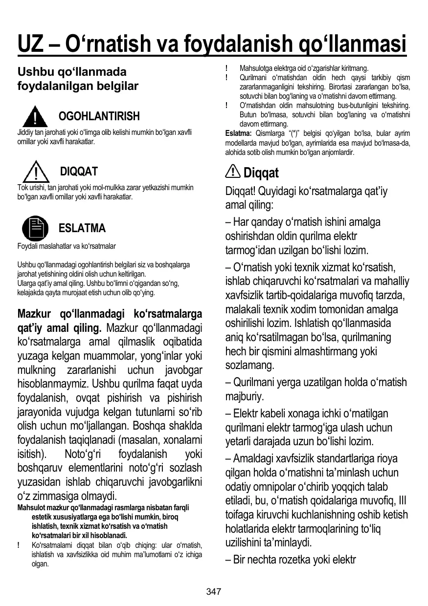Ushbu qo‘llanmada foydalanilgan belgilar OGOHLANTIRISH Jiddiy tan jarohati yoki oʻlimga olib kelishi mumkin boʻlgan xavfli omillar yoki xavfli harakatlar.