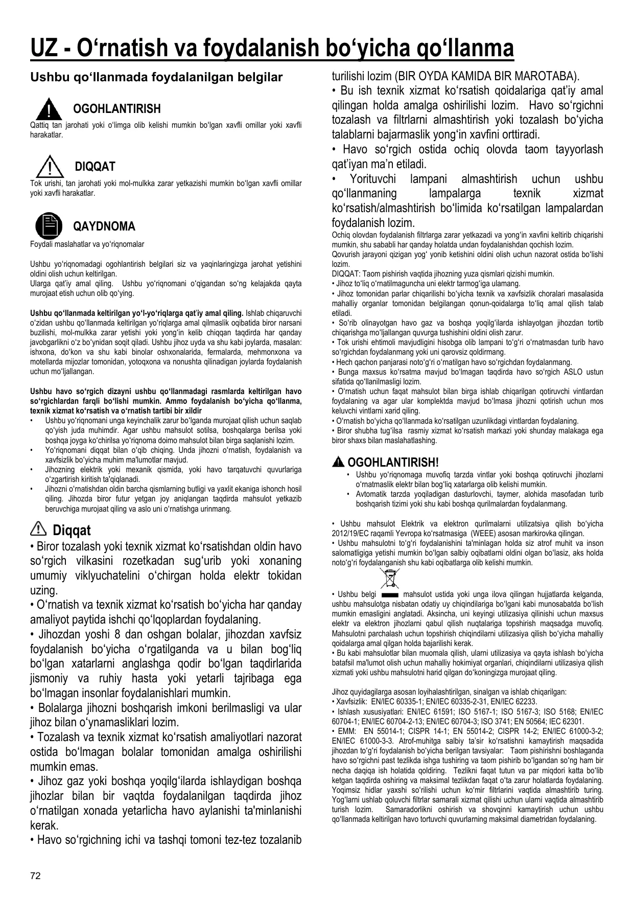 • Les enfants ne doivent pas jouer avec l’appareil. • Le nettoyage et l’entretien par l’usager ne doivent pas être effectués par des enfants sans surveillance. • La pièce doit avoir une aération suffisante lorsque la hotte est utilisée conjointement avec d'autres appareils fonctionnant au gaz ou autres combustibles. • La hotte doit être régulièrement nettoyée à la fois à l'intérieur et à l'extérieur (AU MOINS UNE FOIS PAR MOIS); cela devrait se faire en conformité avec les instructions d'entretien. Le non respect des instructions