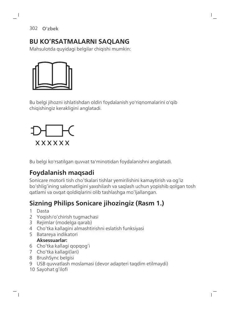 - Consommateurs de votre pays. Si le câble USB est endommagé, cessez de l’utiliser. Gardez les chargeurs à l’écart de l’eau. Après les avoir nettoyés, assurez-vous que les chargeurs et les coffrets de voyage sont complètement secs avant de les brancher. Cet appareil peut être utilisé par des enfants, des personnes dont les capacités physiques, sensorielles ou intellectuelles sont réduites ou des personnes manquant d'expérience et de connaissances, à condition que ces enfants ou personnes soient sous surveillance ou qu'ils aient reçu des instructions quant à l'utilisation sécurisée de l'appareil et qu'ils aient pris connaissance des dangers encourus. Le nettoyage et l'entretien ne doivent pas être effectués par des enfants sans surveillance. Les enfants doivent être surveillés pour s'assurer qu'ils ne s'amusent pas avec le produit. Ne nettoyez aucune pièce du produit au lave-vaisselle. N’utilisez pas les adaptateurs et chargeurs à l’extérieur ou près de surfaces chauffantes. Cet appareil a été conçu uniquement pour le brossage des dents, des gencives et de la langue.