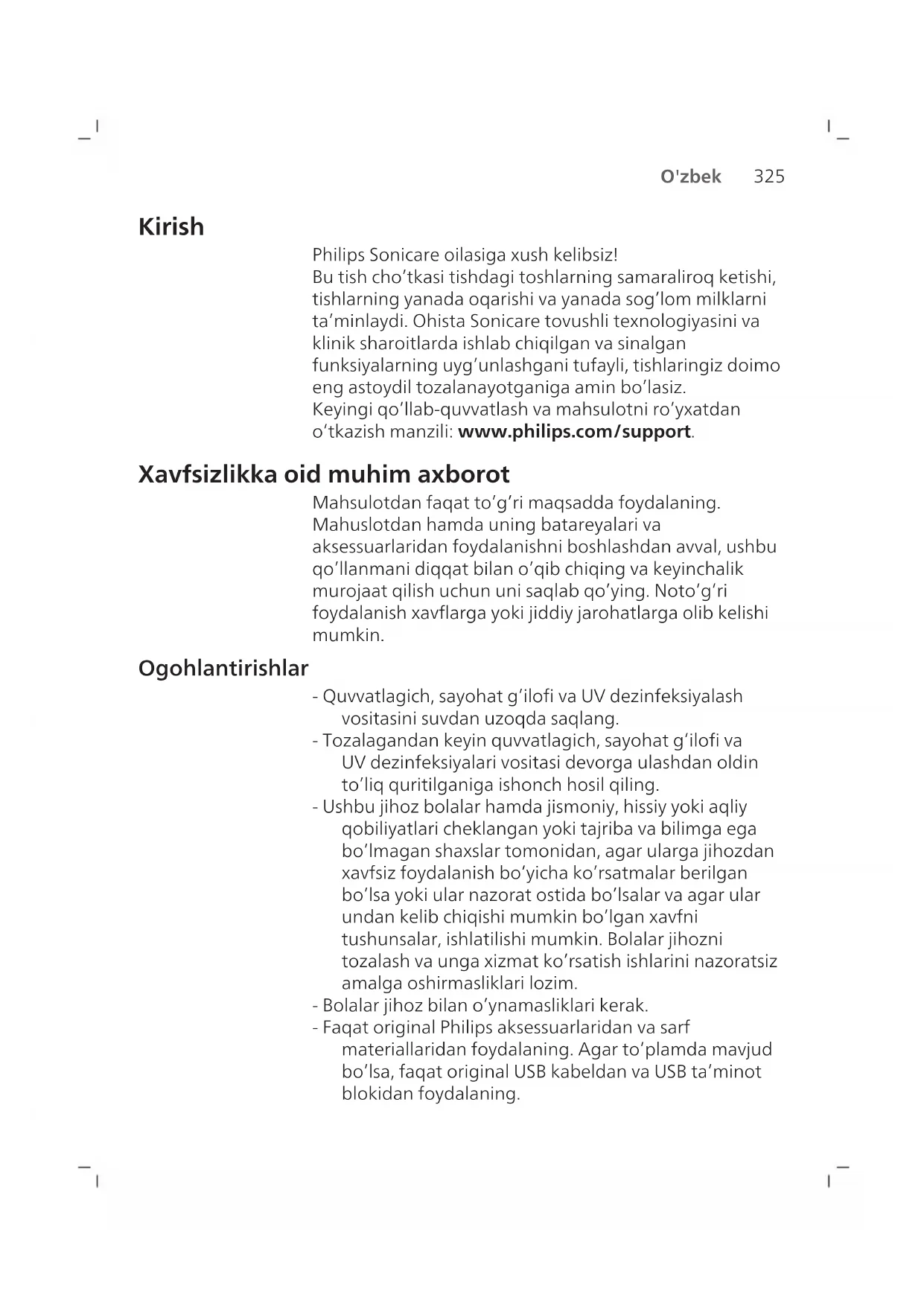 O'zbek Kirish Philips Sonicare oilasiga xush kelibsiz! Bu tish choʻtkasi tishdagi toshlarning samaraliroq ketishi, tishlarning yanada oqarishi va yanada sogʻlom milklarni taʼminlaydi. Ohista Sonicare tovushli texnologiyasini va klinik sharoitlarda ishlab chiqilgan va sinalgan funksiyalarning uygʻunlashgani tufayli, tishlaringiz doimo eng astoydil tozalanayotganiga amin boʻlasiz. Keyingi qoʻllab-quvvatlash va mahsulotni roʻyxatdan oʻtkazish manzili: www.philips.com/support. Xavfsizlikka oid muhim axborot Mahsulotdan faqat toʻgʻri maqsadda foydalaning. Mahuslotdan hamda uning batareyalari va aksessuarlaridan foydalanishni boshlashdan avval, ushbu qoʻllanmani diqqat bilan oʻqib chiqing va keyinchalik murojaat qilish uchun uni saqlab qoʻying. Notoʻgʻri foydalanish xavflarga yoki jiddiy jarohatlarga olib kelishi mumkin. Ogohlantirishlar - Quvvatlagich, sayohat gʻilofi va UV dezinfeksiyalash vositasini suvdan uzoqda saqlang. - Tozalagandan keyin quvvatlagich, sayohat gʻilofi va UV dezinfeksiyalari vositasi devorga ulashdan oldin toʻliq quritilganiga ishonch hosil qiling. - Ushbu jihoz bolalar hamda jismoniy, hissiy yoki aqliy qobiliyatlari cheklangan yoki tajriba va bilimga ega boʻlmagan shaxslar tomonidan, agar ularga jihozdan xavfsiz foydalanish boʻyicha koʻrsatmalar berilgan boʻlsa yoki ular nazorat ostida boʻlsalar va agar ular undan kelib chiqishi mumkin boʻlgan xavfni tushunsalar, ishlatilishi mumkin. Bolalar jihozni tozalash va unga xizmat koʻrsatish ishlarini nazoratsiz amalga oshirmasliklari lozim. - Bolalar jihoz bilan oʻynamasliklari kerak. - Faqat original Philips aksessuarlaridan va sarf materiallaridan foydalaning. Agar toʻplamda mavjud boʻlsa, faqat original USB kabeldan va USB taʼminot blokidan foydalaning.326 O'zbek - Jihoz foydalanuvchi xizmat koʻrsata olmaydigan qismlarga ega. Agar jihoz shikastlangan boʻlsa, undan foydalanishni toʻxtating va mamlakatingizdagi (qarang "Kafolat va qoʻllab-quvvatlash") Mijozlarga xizmat koʻrsatish markaziga murojaat qiling. - Agar USB kabeli yoki USB quvvat taʼminoti bloki shikastlansa, undan foydalanishdan toʻxtang. - Quvvatlagich, sayohat gʻilofi va/yoki UV dezinfeksiyalash vositasini tashqarida yoki issiq yuzalar yaqinida ishlatmang. - Mahsulotning hech bir qismini idish yuvish mashinasida tozalamang. - Jihoz faqat tishlarni, milklarni va tilni tozalash uchun ishlab chiqilgan. - UV dezinfeksiyalash vositasini har doim bolalar ololmaydigan joyda saqlang. - UV dezinfeksiyalash vositasini UV dezinfeksiyalash vositasi ochiq boʻlganda UV LED/lampasi yoniq qoladigan boʻlsa, foydalanishdan toʻxtating. Ultrabinafsha nur odam koʻziga va terisiga zararli boʻlishi mumkin. - Sanitayzerdan faqat oʻrnatilgan himoya ekrani bilan foydalaning. - Ultrabinafsha sanitayzerning ultrabinafsha chirogʻi issiqligida sanitayzerga teginmang. - Tuklari singan yoki bukilgan choʻtka kallagidan foydalanishni toʻxtating. Choʻtka kallagini har 3 oyda yoki agar eskirganlik belgilari namoyon boʻlsa – undan ham tezroq almashtiring. - Tarkibida efir moylari yoki kokos moyi boʻlgan mahsulotlarning bevosita teginishidan saqlaning. Teginish – choʻtkaning siljib qolishiga olib kelishi mumkin. - Foydalanishning maksimal balandligi – 4500 metr. TIBBIY OGOHLANTIRISHLAR - Agar foydalanishdan keyin ortiqcha qon chiqishi kuzatilsa, qon chiqishi 1 hafta foydalangandan keyin ham davom etsa yoki noqulaylik va ogʻriq his qilsangiz, jihozdan foydalanishni toʻxtating va stomatolog/shifokorga murojaat qiling.327 O'zbek - Agar oxirgi 2 oy ichida ogʻizda yoki milklarda jarrohlik ishlari olib borilgan boʻlsa, jihozdan foydalanishdan avval shifokor bilan maslahatlashing. - Agar sizga kardiostimulyator yoki boshqa qurilma implantatsiya qilingan boʻlsa, foydalanishdan oldin shifokor bilan yoki implantatsiya qilingan qurilma ishlab chiqaruvchisi bilan maslahatlashing. - Agar salomatligingizda masalalar bor boʻlsa, ushbu jihozdan foydalanishdan avval shifokor bilan maslahatlashing. - Ushbu jihoz shaxsiy parvarish qurilmasi boʻlib, stomatologik klinikada yoki muassasada bir necha bemorlar foydalanishi uchun moʻljallanmagan. Batareya xavfsizligi koʻrsatmalari - Bu jihozda faqat malakali shaxslar almashtira oladigan batareyalar mavjud. - Mahsulotdan faqat toʻgʻri maqsadda foydalaning. Mahsulotdan hamda uning batareyalari va aksessuarlaridan foydalanishni boshlashdan oldin ushbu axborotni diqqat bilan oʻqib chiqing va keyinchalik murojaat qilish uchun uni saqlab qoʻying. Notoʻgʻri foydalanish xavflarga yoki jiddiy jarohatlarga olib kelishi mumkin. Taqdim etilayotgan aksessuarlar turli mahsulotlarda oʻzaro farqlanishi mumkin. - Faqat original Philips aksessuarlari va sarf materiallaridan foydalaning. Faqat ajratiladigan taʼminot blokidan TCBxxxx foydalaning (kirish parametrlari: 100 - 240V~; 50/60Hz; 1.5W),HX6100 (kirish parametrlari: 100 - 240V~; 50/60Hz; 1.4W),HX6110 (kirish parametrlari: 100 - 240V~; 50/60Hz; 1.5W),HX6160 (kirish parametrlari: 100 - 240V~; 50/60Hz; 6W),WAAxxxx (kirish parametrlari: