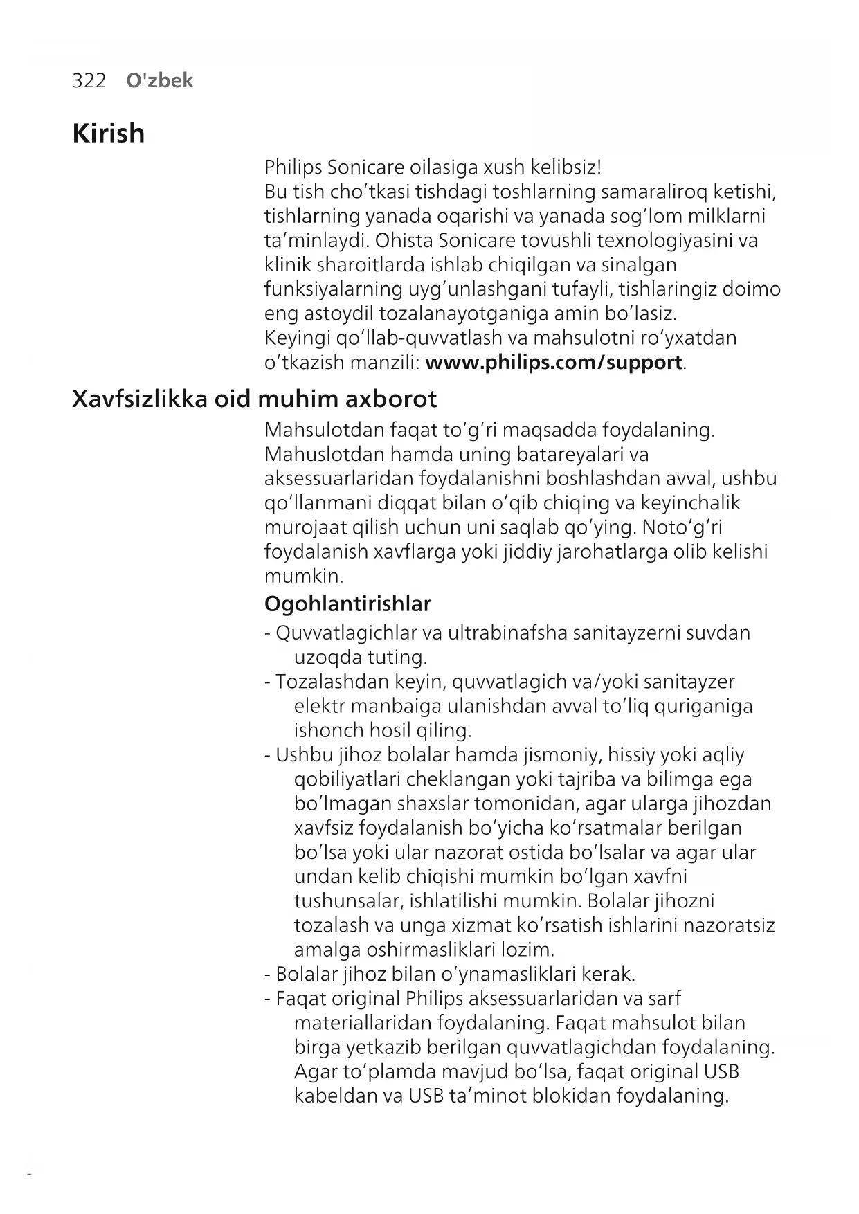 O'zbek Kirish Philips Sonicare oilasiga xush kelibsiz! Bu tish choʻtkasi tishdagi toshlarning samaraliroq ketishi, tishlarning yanada oqarishi va yanada sogʻlom milklarni taʼminlaydi. Ohista Sonicare tovushli texnologiyasini va klinik sharoitlarda ishlab chiqilgan va sinalgan funksiyalarning uygʻunlashgani tufayli, tishlaringiz doimo eng astoydil tozalanayotganiga amin boʻlasiz. Keyingi qoʻllab-quvvatlash va mahsulotni roʻyxatdan oʻtkazish manzili: www.philips.com/support. Xavfsizlikka oid muhim axborot Mahsulotdan faqat toʻgʻri maqsadda foydalaning. Mahuslotdan hamda uning batareyalari va aksessuarlaridan foydalanishni boshlashdan avval, ushbu qoʻllanmani diqqat bilan oʻqib chiqing va keyinchalik murojaat qilish uchun uni saqlab qoʻying. Notoʻgʻri foydalanish xavflarga yoki jiddiy jarohatlarga olib kelishi mumkin. Ogohlantirishlar - Quvvatlagichlar va ultrabinafsha sanitayzerni suvdan uzoqda tuting. - Tozalashdan keyin, quvvatlagich va/yoki sanitayzer elektr manbaiga ulanishdan avval toʻliq quriganiga ishonch hosil qiling. - Ushbu jihoz bolalar hamda jismoniy, hissiy yoki aqliy qobiliyatlari cheklangan yoki tajriba va bilimga ega boʻlmagan shaxslar tomonidan, agar ularga jihozdan xavfsiz foydalanish boʻyicha koʻrsatmalar berilgan boʻlsa yoki ular nazorat ostida boʻlsalar va agar ular undan kelib chiqishi mumkin boʻlgan xavfni tushunsalar, ishlatilishi mumkin. Bolalar jihozni tozalash va unga xizmat koʻrsatish ishlarini nazoratsiz amalga oshirmasliklari lozim. - Bolalar jihoz bilan oʻynamasliklari kerak. - Faqat original Philips aksessuarlaridan va sarf materiallaridan foydalaning. Faqat mahsulot bilan birga yetkazib berilgan quvvatlagichdan foydalaning. Agar toʻplamda mavjud boʻlsa, faqat original USB kabeldan va USB taʼminot blokidan foydalaning.323 O'zbek - Jihoz foydalanuvchi xizmat koʻrsata olmaydigan qismlarga ega. Agar jihoz shikastlangan boʻlsa, undan foydalanishni toʻxtating va mamlakatingizdagi Mijozlarga xizmat koʻrsatish markaziga murojaat qiling. Faqat kabelli qurilmalar: Agar kabel shikastlangan boʻlsa, quvvatlagich bilan sanitayzerni yangisiga almashtiring. - Quvvatlagichdan va/yoki sanitayzerdan tashqarida yoki isitiladigan yuzalar yaqinida foydalanmang. - Mahsulotning hech bir qismini idish yuvish mashinasida tozalamang. - Jihoz faqat tishlarni, milklarni va tilni tozalash uchun ishlab chiqilgan. - Doim sanitayzerni bolalardan uzoqda tuting. - Ultrabinafsha chiroq eshik ochilganda ham yonib tursa, sanitayzerdan foydalanishni toʻxtating. Ultrabinafsha nur odam koʻziga va terisiga zararli boʻlishi mumkin. - Sanitayzerdan faqat oʻrnatilgan himoya ekrani bilan foydalaning. - Ultrabinafsha sanitayzerning ultrabinafsha chirogʻi issiqligida sanitayzerga teginmang. - Tuklari singan yoki bukilgan choʻtka kallagidan foydalanishni toʻxtating. Choʻtka kallagini har 3 oyda yoki agar eskirganlik belgilari namoyon boʻlsa – undan ham tezroq almashtiring. - Tarkibida efir moylari yoki kokos moyi boʻlgan mahsulotlarning bevosita teginishidan saqlaning. Teginish – choʻtkaning siljib qolishiga olib kelishi mumkin. - Agar foydalanishdan keyin ortiqcha qon chiqishi kuzatilsa, qon chiqishi 1 hafta foydalangandan keyin ham davom etsa yoki noqulaylik va ogʻriq his qilsangiz, jihozdan foydalanishni toʻxtating va stomatolog/shifokorga murojaat qiling. - Agar oxirgi 2 oy ichida ogʻizda yoki milklarda jarrohlik ishlari olib borilgan boʻlsa, jihozdan foydalanishdan avval shifokor bilan maslahatlashing.324 O'zbek - Agar sizga kardiostimulyator yoki boshqa qurilma implantatsiya qilingan boʻlsa, foydalanishdan oldin shifokor bilan yoki implantatsiya qilingan qurilma ishlab chiqaruvchisi bilan maslahatlashing. - Agar salomatligingizda masalalar bor boʻlsa, ushbu jihozdan foydalanishdan avval shifokor bilan maslahatlashing. - Ushbu jihoz shaxsiy parvarish qurilmasi boʻlib, stomatologik klinikada yoki muassasada bir necha bemorlar foydalanishi uchun moʻljallanmagan. Batareya xavfsizligi koʻrsatmalari - Bu jihozda faqat malakali shaxslar almashtira oladigan batareyalar mavjud - Mahsulotdan faqat toʻgʻri maqsadda foydalaning. Mahsulotdan hamda uning batareyalari va aksessuarlaridan foydalanishni boshlashdan oldin ushbu axborotni diqqat bilan oʻqib chiqing va keyinchalik murojaat qilish uchun uni saqlab qoʻying. Notoʻgʻri foydalanish xavflarga yoki jiddiy jarohatlarga olib kelishi mumkin. Taqdim etilayotgan aksessuarlar turli mahsulotlarda oʻzaro farqlanishi mumkin. - Faqat original Philips aksessuarlari va sarf materiallaridan foydalaning. Faqat TCBxxxx, HX6100, HX6110, HX6160 yoki WAAxxxx ajraladigan taʼminot blokidan foydalaning. - Mahsulotni va batareyalarni olovdan nari tuting va quyosh yoki yuqori harorat taʼsirida qoldirmang. - Agar mahsulot noodatiy qizib ketsa yoki hid chiqarsa yoki rangini oʻzgartirsa yoki odatdagidan uzoq vaqt quvvatlansa, undan foydalanishni va quvvatlashni toʻxtating va Philips kompaniyasiga murojaat qiling. - Mahsulotni va uning batareyalarini mikrotoʻlqinli pechga yoki induksiyali plitaga qoʻymang. - Batareyalar qizishi yoki zaharli va xavfli moddalar ajralishining oldini olish uchun jihozni yoki batareyani ochmang, oʻzgartirmang, teshmang, shikastlamang yoki qismlarga ajratmang. Qayta quvvatlanadigan batareyalarning qisqa tutashuviga, ortiqcha quvvatlanishiga yoki teskari quvvatlanishiga yoʻl qoʻymang.325 O'zbek - Bu jihozda almashtirib boʻlmaydigan batareyalar mavjud. Batareya xizmat muddatining oxiriga yetganida jihoz tegishli tartibda chiqitga chiqarilishi kerak, qayta ishlash boʻlimiga qarang. - Agar batareyalar shikastlansa yoki undan suyuqlik sizib chiqsa, teri yoki koʻz bilan teginishdan saqlaning. Agar bu sodir boʻlgan boʻlsa, suv bilan yaxshilab chaying va tibbiy yordamga murojaat qiling. - Batareyani qoʻlga olganingizda, qoʻllaringiz, mahsulot va batareyalar quruq ekanligiga ishonch hosil qiling. - Batareyani ajratib olgach, qisqa tutashuv sodir boʻlmasligi uchun batareya klemmalariga met