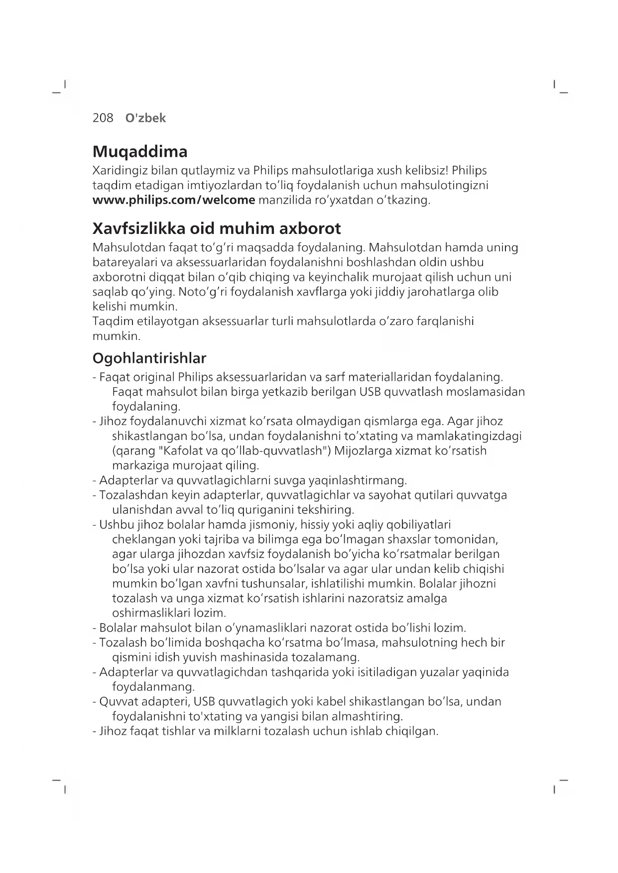 O'zbek Muqaddima Xaridingiz bilan qutlaymiz va Philips mahsulotlariga xush kelibsiz! Philips taqdim etadigan imtiyozlardan toʻliq foydalanish uchun mahsulotingizni www.philips.com/welcome manzilida roʻyxatdan oʻtkazing. Xavfsizlikka oid muhim axborot Mahsulotdan faqat toʻgʻri maqsadda foydalaning. Mahsulotdan hamda uning batareyalari va aksessuarlaridan foydalanishni boshlashdan oldin ushbu axborotni diqqat bilan oʻqib chiqing va keyinchalik murojaat qilish uchun uni saqlab qoʻying. Notoʻgʻri foydalanish xavflarga yoki jiddiy jarohatlarga olib kelishi mumkin. Taqdim etilayotgan aksessuarlar turli mahsulotlarda oʻzaro farqlanishi mumkin. Ogohlantirishlar - Faqat original Philips aksessuarlaridan va sarf materiallaridan foydalaning. Faqat mahsulot bilan birga yetkazib berilgan USB quvvatlash moslamasidan foydalaning. - Jihoz foydalanuvchi xizmat koʻrsata olmaydigan qismlarga ega. Agar jihoz shikastlangan boʻlsa, undan foydalanishni toʻxtating va mamlakatingizdagi (qarang "Kafolat va qoʻllab-quvvatlash") Mijozlarga xizmat koʻrsatish markaziga murojaat qiling. - Adapterlar va quvvatlagichlarni suvga yaqinlashtirmang. - Tozalashdan keyin adapterlar, quvvatlagichlar va sayohat qutilari quvvatga ulanishdan avval toʻliq quriganini tekshiring. - Ushbu jihoz bolalar hamda jismoniy, hissiy yoki aqliy qobiliyatlari cheklangan yoki tajriba va bilimga ega boʻlmagan shaxslar tomonidan, agar ularga jihozdan xavfsiz foydalanish boʻyicha koʻrsatmalar berilgan boʻlsa yoki ular nazorat ostida boʻlsalar va agar ular undan kelib chiqishi mumkin boʻlgan xavfni tushunsalar, ishlatilishi mumkin. Bolalar jihozni tozalash va unga xizmat koʻrsatish ishlarini nazoratsiz amalga oshirmasliklari lozim. - Bolalar mahsulot bilan oʻynamasliklari nazorat ostida boʻlishi lozim. - Tozalash bo‘limida boshqacha ko‘rsatma bo‘lmasa, mahsulotning hech bir qismini idish yuvish mashinasida tozalamang. - Adapterlar va quvvatlagichdan tashqarida yoki isitiladigan yuzalar yaqinida foydalanmang. - Quvvat adapteri, USB quvvatlagich yoki kabel shikastlangan boʻlsa, undan foydalanishni to'xtating va yangisi bilan almashtiring. - Jihoz faqat tishlar va milklarni tozalash uchun ishlab chiqilgan.209 O'zbek - Choʻtka kallagini har 3 oyda yoki agar eskirganlik belgilari namoyon boʻlsa – undan ham tezroq almashtiring. Tuklari singan yoki bukilgan choʻtka kallagidan foydalanishni toʻxtating. - Dastani, ayniqsa, choʻtka kallagi ulanadigan joyni chaying. Rezina zichlagich atrofini ohista tozalang. - Choʻtka kallagi va tish choʻtkasini sayohat gʻilofiga solishdan oldin ularning quruqligini tekshiring. - Tarkibida efir moylari yoki kokos moyi boʻlgan mahsulotlarning bevosita teginishidan saqlaning. Teginish – choʻtkaning siljib qolishiga olib kelishi mumkin. - Foydalanishning maksimal balandligi – 4500 metr. - Philips mahsulotlari tarkibida mavjud REACH moddalari haqida ma'lumotlarni www.philips.com/REACH saytida topish mumkin Tibbiy ogohlantirishlar - Agar foydalanishdan keyin ortiqcha qon chiqishi kuzatilsa yoki noqulaylik va ogʻriq his qilsangiz, jihozdan foydalanishni toʻxtating va stomatolog/shifokorga murojaat qiling. - Agar sizga kardiostimulyator yoki boshqa qurilma implantatsiya qilingan boʻlsa, foydalanishdan oldin shifokor bilan yoki implantatsiya qilingan qurilma ishlab chiqaruvchisi bilan maslahatlashing. - Bu qurilma shaxsiy parvarishlash qurilmasi boʻlib, uni bir nechta foydalanuvchilar bilan baham koʻrish uchun moʻljallanmagan. Batareya xavfsizligi koʻrsatmalari - Bu jihozda faqat malakali shaxslar chiqara oladigan batareyalar mavjud. - Mahsulotni va batareyalarni olovdan nari tuting va quyosh yoki yuqori harorat taʼsirida qoldirmang. - Agar mahsulot noodatiy qizib ketsa yoki hid chiqarsa yoki rangini oʻzgartirsa yoki odatdagidan uzoq vaqt quvvatlansa, undan foydalanishni va quvvatlashni toʻxtating va Philips kompaniyasiga murojaat qiling. - Mahsulotni va uning batareyalarini mikrotoʻlqinli pechga yoki induksiyali plitaga qoʻymang. - Batareyalar qizishi yoki zaharli va xavfli moddalar ajralishining oldini olish uchun jihozni yoki batareyani ochmang, oʻzgartirmang, teshmang, shikastlamang yoki qismlarga ajratmang. Qayta quvvatlanadigan batareyalarning qisqa tutashuviga, ortiqcha quvvatlanishiga yoki teskari quvvatlanishiga yoʻl qoʻymang. - Bu jihozda almashtirib boʻlmaydigan batareyalar mavjud. Batareya xizmat muddatining oxiriga yetganida jihoz tegishli tarzda chiqindiga tashlanishi kerak, Qayta ishlash boʻlimiga qarang.210 O'zbek - Faqat Philips WAA1001, WAA2001, kirish darajasi (100‑240V~; 50/60Gts; 3,5Vt) va chiqish darajalari (5Vdc; 2,5Vt) boʻlgan xavfsizlik bilan tasdiqlangan IPX4 adapterlari bilan quvvatlang. Adapterlar roʻyxati bilan www.philips.com/support sahifasi orqali tanishib chiqish mumkin. - Mahsulotni 0 °C va 40 °C orasidagi haroratda quvvatlang va ishlating. Saqlash va tashish sharoitlari Harorat -20 °C to +60 °C (-4°F dan 140°F gacha) gacha. Elektromagnit maydonlar (EMF) Ushbu Philips jihozi elektromagnit maydon taʼsiriga taalluqli, amaldagi barcha standartlar va normalarga mos keladi.