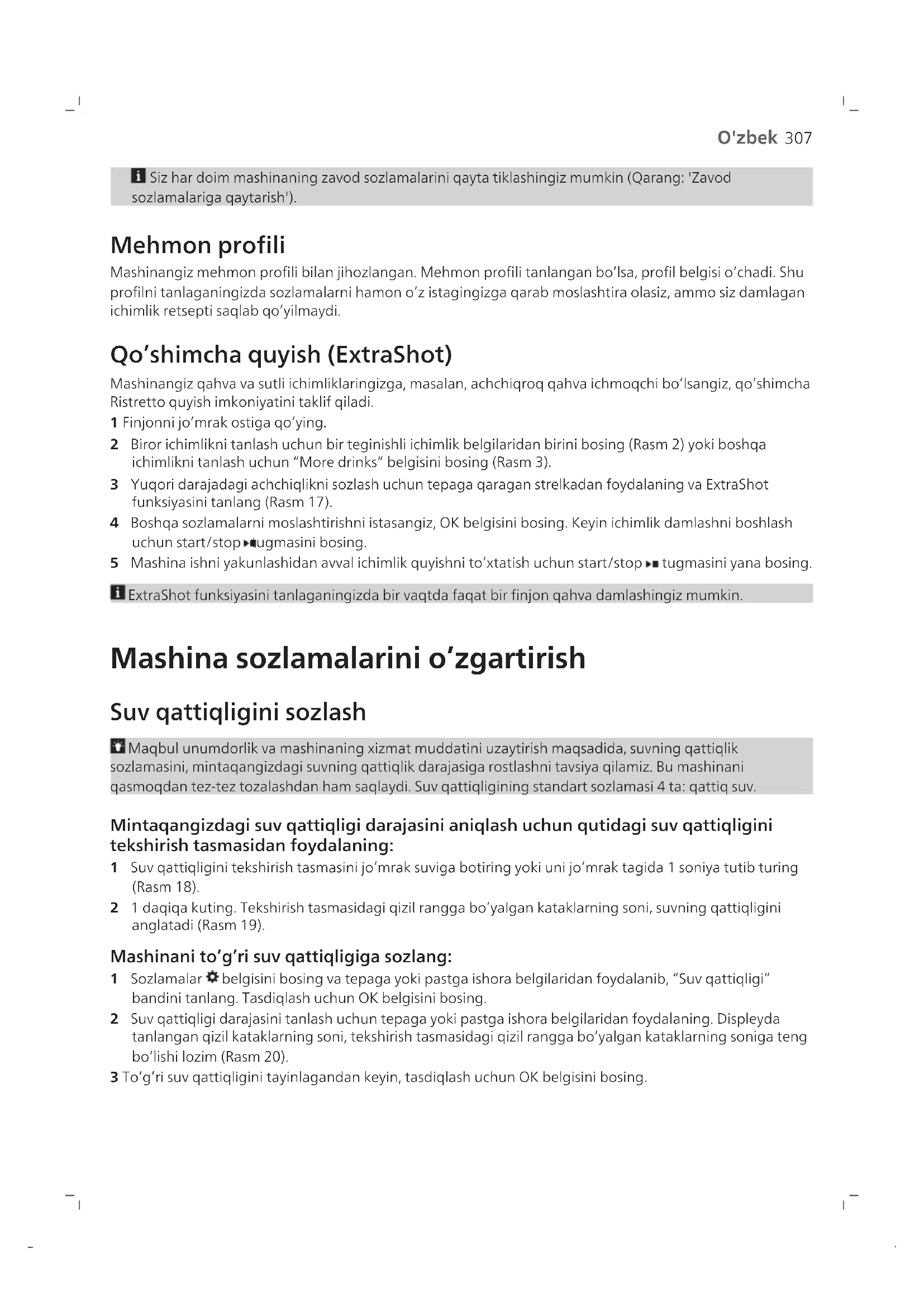 Endi yangi sozlamalaringiz siz tanlagan rangli profilda saqlandi.307 O'zbek Siz har doim mashinaning zavod sozlamalarini qayta tiklashingiz mumkin (Qarang: 'Zavodsozlamalariga qaytarish'). Mehmon profili Mashinangiz mehmon profili bilan jihozlangan. Mehmon profili tanlangan boʻlsa, profil belgisi oʻchadi. Shuprofilni tanlaganingizda sozlamalarni hamon oʻz istagingizga qarab moslashtira olasiz, ammo siz damlaganichimlik retsepti saqlab qoʻyilmaydi. Qoʻshimcha quyish (ExtraShot) Mashinangiz qahva va sutli ichimliklaringizga, masalan, achchiqroq qahva ichmoqchi boʻlsangiz, qoʻshimchaRistretto quyish imkoniyatini taklif qiladi. 1 Finjonni joʻmrak ostiga qoʻying. 2 Biror ichimlikni tanlash uchun bir teginishli ichimlik belgilaridan birini bosing (Rasm 2) yoki boshqa ichimlikni tanlash uchun “More drinks” belgisini bosing (Rasm 3). 3 Yuqori darajadagi achchiqlikni sozlash uchun tepaga qaragan strelkadan foydalaning va ExtraShot funksiyasini tanlang (Rasm 17). 4 Boshqa sozlamalarni moslashtirishni istasangiz, OK belgisini bosing. Keyin ichimlik damlashni boshlash uchun start/stop tugmasini bosing. 5 Mashina ishni yakunlashidan avval ichimlik quyishni toʻxtatish uchun start/stop tugmasini yana bosing. ExtraShot funksiyasini tanlaganingizda bir vaqtda faqat bir finjon qahva damlashingiz mumkin. Mashina sozlamalarini oʻzgartirish Suv qattiqligini sozlash Maqbul unumdorlik va mashinaning xizmat muddatini uzaytirish maqsadida, suvning qattiqliksozlamasini, mintaqangizdagi suvning qattiqlik darajasiga rostlashni tavsiya qilamiz. Bu mashinaniqasmoqdan tez-tez tozalashdan ham saqlaydi. Suv qattiqligining standart sozlamasi 4 ta: qattiq suv. Mintaqangizdagi suv qattiqligi darajasini aniqlash uchun qutidagi suv qattiqligini tekshirish tasmasidan foydalaning: 1 Suv qattiqligini tekshirish tasmasini joʻmrak suviga botiring yoki uni joʻmrak tagida 1 soniya tutib turing (Rasm 18). 2 1 daqiqa kuting. Tekshirish tasmasidagi qizil rangga boʻyalgan kataklarning soni, suvning qattiqligini anglatadi (Rasm 19). Mashinani toʻgʻri suv qattiqligiga sozlang: 1 Sozlamalar belgisini bosing va tepaga yoki pastga ishora belgilaridan foydalanib, “Suv qattiqligi” bandini tanlang. Tasdiqlash uchun OK belgisini bosing. 2 Suv qattiqligi darajasini tanlash uchun tepaga yoki pastga ishora belgilaridan foydalaning. Displeyda tanlangan qizil kataklarning soni, tekshirish tasmasidagi qizil rangga boʻyalgan kataklarning soniga tengboʻlishi lozim (Rasm 20).3 Toʻgʻri suv qattiqligini tayinlagandan keyin, tasdiqlash uchun OK belgisini bosing.308 O'zbek Yanchish sozlamasini oʻzgartirish Qahva doni idishi ichidagi yanchishni sozlash murvati bilan qahva achchiqligini oʻzgartirishingiz mumkin. Yanchish sozlamasi qanchalik past boʻlsa, qahva donlari shunchalik maydaroq yanchiladi va qahva achchiqroq boʻladi. Tanlashingiz mumkin boʻlgan 12 ta turli yanchish sozlamasi mavjud. Mashina qahva donlarining eng yaxshi taʼmini chiqarishga sozlangan. Shu sababli 100-150 finjon (taxminan 1 oy foydalanish) qahva damlamasdan yanchish sozlamasini oʻzgartirmaslikni tavsiya qilamiz. Mashina qahva donini yanchayotganda faqat yanchish sozlamasini rostlashingiz mumkin. Taʼmdagi farqni toʻliq his qilguncha 2-3 finjon qahva damlashingiz zarur. Yanchgich shikastlanishidan saqlanish uchun yanchishni sozlash murvatini bir martada bir qadamdan ortiq buramang. 1 Finjonni qahva dispenseri tagiga qoʻying. 2 Qahva doni idishining qopqogʻini oching (Rasm 21). 3 Espresso belgisini bosing va keyin start/stop tugmasini bosing. 4 Yanchgich yanchishni boshlanganida yanchishni sozlash murvatini bosib, uni chap yoki oʻng tomonga burang (Rasm 22). Boshqa mashina sozlamalarini rostlash Sozlamalar belgisini bosib mashinaning quyidagi sozlamalarini rostlashingiz mumkin: