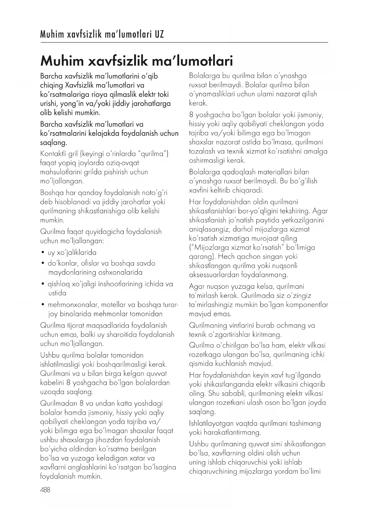 - mehmonxonalar, motellar va boshqa turar- joy binolarida mehmonlar tomonidan Qurilma tijorat maqsadlarida foydalanish uchun emas, balki uy sharoitida foydalanish uchun moʻljallangan. Ushbu qurilma bolalar tomonidan ishlatilmasligi yoki boshqarilmasligi kerak. Qurilmani va u bilan birga kelgan quvvat kabelini 8 yoshgacha boʻlgan bolalardan uzoqda saqlang. Qurilmadan 8 va undan katta yoshdagi bolalar hamda jismoniy, hissiy yoki aqliy qobiliyati cheklangan yoda tajriba va/ yoki bilimga ega boʻlmagan shaxslar faqat ushbu shaxslarga jihozdan foydalanish boʻyicha oldindan koʻrsatma berilgan boʻlsa va yuzaga keladigan xatar va xavflarni anglashlarini koʻrsatgan boʻlsagina foydalanish mumkin. Muhim xavfsizlik maʼlumotlari Bolalarga bu qurilma bilan oʻynashga ruxsat berilmaydi. Bolalar qurilma bilan oʻynamasliklari uchun ularni nazorat qilish kerak. 8 yoshgacha boʻlgan bolalar yoki jismoniy, hissiy yoki aqliy qobiliyati cheklangan yoda tajriba va/yoki bilimga ega boʻlmagan shaxslar nazorat ostida boʻlmasa, qurilmani tozalash va texnik xizmat koʻrsatishni amalga oshirmasligi kerak. Bolalarga qadoqlash materiallari bilan oʻynashga ruxsat berilmaydi. Bu boʻgʻilish xavfini keltirib chiqaradi. Har foydalanishdan oldin qurilmani shikastlanishlari bor-yoʻqligini tekshiring. Agar shikastlanish joʻnatish paytida yetkazilganini aniqlasangiz, darhol mijozlarga xizmat koʻrsatish xizmatiga murojaat qiling (“Mijozlarga xizmat koʻrsatish” boʻlimiga qarang). Hech qachon singan yoki shikastlangan qurilma yoki nuqsonli aksessuarlardan foydalanmang. Agar nuqson yuzaga kelsa, qurilmani taʼmirlash kerak. Qurilmada siz oʻzingiz taʼmirlashingiz mumkin boʻlgan komponentlar mavjud emas. Qurilmaning vintlarini burab ochmang va texnik oʻzgartirishlar kiritmang. Qurilma oʻchirilgan boʻlsa ham, elektr vilkasi rozetkaga ulangan boʻlsa, qurilmaning ichki qismida kuchlanish mavjud. Har foydalanishdan keyin xavf tugʻilganda yoki shikastlanganda elektr vilkasini chiqarib oling. Shu sababli, qurilmaning elektr vilkasi ulangan rozetkani ulash oson boʻlgan joyda saqlang. Ishlatilayotgan vaqtda qurilmani tashimang yoki harakatlantirmang. Ushbu qurilmaning quvvat simi shikastlangan boʻlsa, xavflarning oldini olish uchun uning ishlab chiqaruvchisi yoki ishlab chiqaruvchining mijozlarga yordam boʻlimi UZ489 Muhim xavfsizlik ma’lumotlari UZ yoki shu darajadagi malakali shaxs tomonidan almashtirilishi kerak. Qurilma taymer yoki alohida teleboshqaruv tizimi (masofadan boshqarish) bilan ishlatishga moʻljallanmagan. Zavod yorligʻida koʻrsatilgan kuchlanish rozetka kuchlanishiga mos kelsagina, qurilmadan foydalaning. Qurilmani quruq, tekis, sirgʻanmaydigan yuzaga joylashtiring. Qurilmani issiq yuzaga yoki kuchli issiqlik manbalari yaqiniga qoʻymang. Qurilmani ochiq havoda yoki havo namligi yuqori boʻlgan xonalarda ishlatmang. Qurilmani shkafda ishlatmang. Hech qachon qurilmani gril panjarasisiz ishlatmang. Grilda pishirilgan taom kuyishi mumkin. Qurilmani hech qachon yonuvchan materiallar (masalan, eshik yoki deraza pardalar, devor tokchalari) yaqinida yoki ostida ishlatmang. Qurilma ustidagi maydon har doim toza va toʻsiqsiz boʻlishi kerak. Qurilmani hech qachon oson alangalanishi mumkin boʻlgan yonuvchan materiallar, masalan, benzin yoki spirt yaqin joyda ishlatmang. Qurilmani oson alangalanadigan yuzalarga (masalan, qogʻoz salfetkalar) qoʻymang. Qurilmaning sirtlari juda qizib ketishi mumkin. Har doim tutqichdan yoki kerak boʻlsa, issiqqa chidamli mato yoki qoʻlqoplardan foydalaning. Qurilma ishlayotgan vaqtda uning tashqi yuzasi juda qizib ketishi mumkin. Har doim tutqichni yoki kerak boʻlsa, pech dastaklarini ishlating. Qurilmani nazorat qilmaganingizda elektr vilkasini rozetkadan chiqarib oling. Grilda pishirish vaqtida qurilmani qarovsiz qoldirmang. Qurilmani tozalash yoki xizmat koʻrsatishdan oldin qurilmani oʻchiring va elektr vilkasini rozetkadan chiqarib oling. Elektr shnuriga hech qachon nam qoʻl bilan tegmang. Qurilma ishlayotganida yoki nam yuzada boʻlsa, unga nam qoʻllar bilan tegmang. Elektr vilkasini rozetkadan chiqarib olayotganingizda, har doim elektr vilkasini toʻgʻri torting. Qurilmani quvvat kabelidan tortib tashimang. Elektr shnuri egilib qolmaganligi yoki qisilib qolmaganligiga hamda elektr shnuri va qurilma issiqlik manbalari (masalan, elektr plitalar, gorelka alangasi) bilan aloqa qilmasligiga ishonch hosil qiling. Elektr shnurining osilib qolishi yoki osilib turishiga yoʻl qoʻymang. Ishlatilgandan soʻng shnurni qurilmaning pastki qismidagi kabel boʻlimida saqlang. Gril panjarasini faqat qurilma toʻliq sovigan boʻlsa chiqarib oling yoki almashtiring. Qurilmani hech qachon suvga yoki boshqa suyuqliklarga botirmang, uni oqayotgan suv ostida tozalamang va idish yuvish mashinasiga solmang. Issiq gril panjaralariga sovuq suv yoki yonuvchi suyuqliklarni quymang. Qurilmani faqat toʻliq soviganidan soʻng tashish va tozalash kerak. Qurilmani tozalash uchun sim-latta kabi qattiq tozalash vositalaridan foydalanmang va agressiv yoki abraziv tozalash vositalaridan foydalanmang. Qurilmani saqlashdan oldin: Elektr vilkasini chiqarib oling va qurilmaning toʻliq sovishini kuting. Qurilmani bolalar yoki uy hayvonlari yeta olmaydigan salqin, quruq joyda saqlang.490 Muhim xavfsizlik ma’lumotlari UZ Ishlatilgan belgilar Foydalanish boʻyicha koʻrsatmalarni toʻliq oʻqib chiqing va kelajakda foydalanish uchun saqlab qoʻying. DIQQAT! Baxtsiz hodisa va jarohatlar, shuningdek, jiddiy moddiy zarar ehtimoli. Issiq yuzalar sababli kuyish xavfi Qurilmani ochiq havoda yoki nam muhitda ishlatmang. Himoya toifasi I Qurilma CE belgisi boʻyicha koʻrsatmalarga mos keladi. Texnik maʼlumotlar Quvvat taʼminoti 220–240 V, 50–60 Hz Quvvat chiqishi 2000 W Kutish rejimida quvvat chiqishi < 0,3 W Vazni 8,13 kg Himoya toifasi I Oʻlchamlari 398 x 321 x 150 mm Mundarija Muhim xavfsizlik maʼlumotlari 1 Sharhi 4 Sharh/Ishlashi 5 Displey 5 Ilk foydalanishdan oldin 6 Ishlash rejim