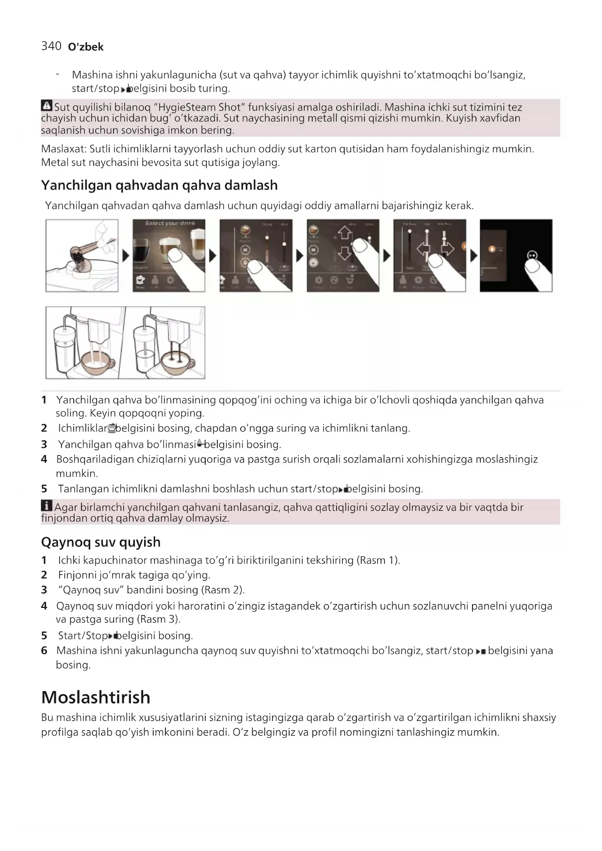 Mashina ishni yakunlagunicha (sut va qahva) tayyor ichimlik quyishni toʻxtatmoqchi boʻlsangiz, start/stop belgisini bosib turing. Sut quyilishi bilanoq “HygieSteam Shot” funksiyasi amalga oshiriladi. Mashina ichki sut tizimini tez chayish uchun ichidan bugʻ oʻtkazadi. Sut naychasining metall qismi qizishi mumkin. Kuyish xavfidan saqlanish uchun sovishiga imkon bering. Maslaxat: Sutli ichimliklarni tayyorlash uchun oddiy sut karton qutisidan ham foydalanishingiz mumkin. Metal sut naychasini bevosita sut qutisiga joylang. Yanchilgan qahvadan qahva damlash Yanchilgan qahvadan qahva damlash uchun quyidagi oddiy amallarni bajarishingiz kerak. 1 Yanchilgan qahva boʻlinmasining qopqogʻini oching va ichiga bir oʻlchovli qoshiqda yanchilgan qahva soling. Keyin qopqoqni yoping. 2 Ichimliklar belgisini bosing, chapdan oʻngga suring va ichimlikni tanlang. 3 Yanchilgan qahva boʻlinmasi belgisini bosing. 4 Boshqariladigan chiziqlarni yuqoriga va pastga surish orqali sozlamalarni xohishingizga moslashingiz mumkin. 5 Tanlangan ichimlikni damlashni boshlash uchun start/stop belgisini bosing. Agar birlamchi yanchilgan qahvani tanlasangiz, qahva qattiqligini sozlay olmaysiz va bir vaqtda bir finjondan ortiq qahva damlay olmaysiz. Qaynoq suv quyish 1 Ichki kapuchinator mashinaga toʻgʻri biriktirilganini tekshiring (Rasm 1). 2 Finjonni joʻmrak tagiga qoʻying. 3 “Qaynoq suv” bandini bosing (Rasm 2). 4 Qaynoq suv miqdori yoki haroratini oʻzingiz istagandek oʻzgartirish uchun sozlanuvchi panelni yuqoriga va pastga suring (Rasm 3). 5 Start/Stop belgisini bosing. 6 Mashina ishni yakunlaguncha qaynoq suv quyishni toʻxtatmoqchi boʻlsangiz, start/stop belgisini yana bosing. Moslashtirish Bu mashina ichimlik xususiyatlarini sizning istagingizga qarab oʻzgartirish va oʻzgartirilgan ichimlikni shaxsiy profilga saqlab qoʻyish imkonini beradi. Oʻz belgingiz va profil nomingizni tanlashingiz mumkin.341 O'zbek CoffeeMaestro bilan tezlashtiring Mashinangiz barcha sozlamalarni alohida oʻzgartirish oʻrniga CoffeeMaestro funksiyasi bilan taʼm profillarini tanlash imkoniyati taklif qiladi. Delicato, Intenso va Forte orasidan tanlashingiz mumkin. CoffeeMaestro taʼm profilini tanlash uchun: 1 Oʻzingizga yoqqan ichimlik belgisini bosing (Rasm 4). 2 CoffeeMaestro belgisini qayta-qayta bosing (Rasm 5).