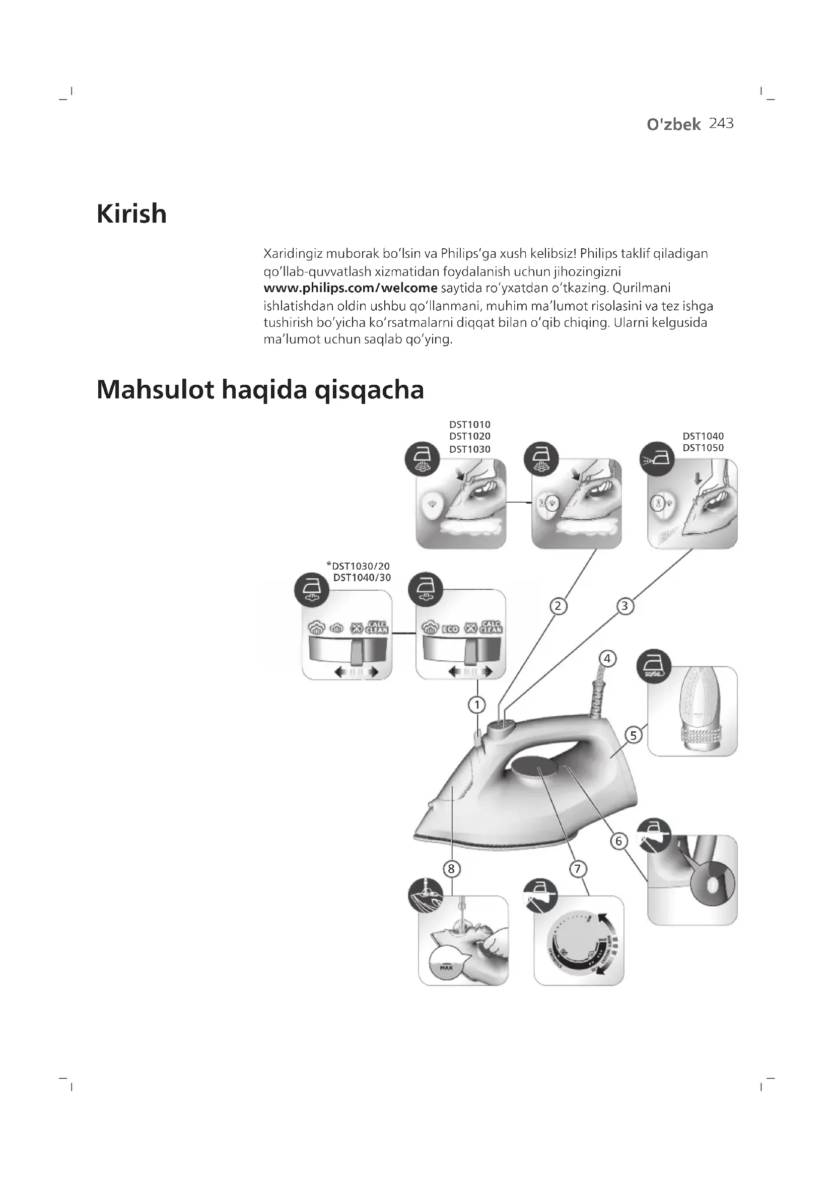 Kirish Xaridingiz muborak boʻlsin va Philipsʻga xush kelibsiz! Philips taklif qiladigan qoʻllab-quvvatlash xizmatidan foydalanish uchun jihozingizni www.philips.com/welcome saytida roʻyxatdan oʻtkazing. Qurilmani ishlatishdan oldin ushbu qoʻllanmani, muhim maʼlumot risolasini va tez ishga tushirish boʻyicha koʻrsatmalarni diqqat bilan oʻqib chiqing. Ularni kelgusida maʼlumot uchun saqlab qoʻying. Mahsulot haqida qisqacha