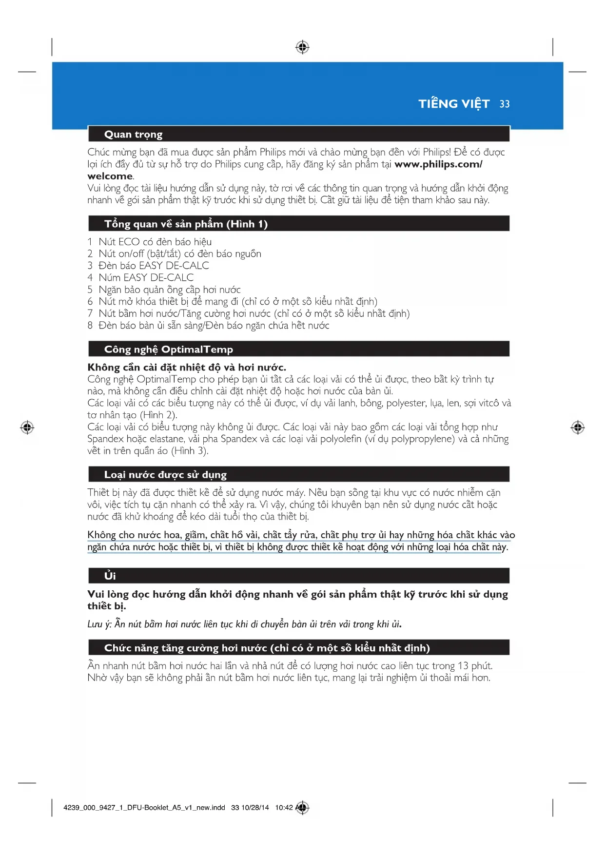 4239_000_9427_1_DFU-Booklet_A5_v1_new.indd 33 10/28/14 10:42 AMTiết kiệm năng lượng - chế độ ECO Với chế độ ECO (giảm lượng hơi nước), bạn có thể tiết kiệm năng lượng mà không làm ảnh hưởng