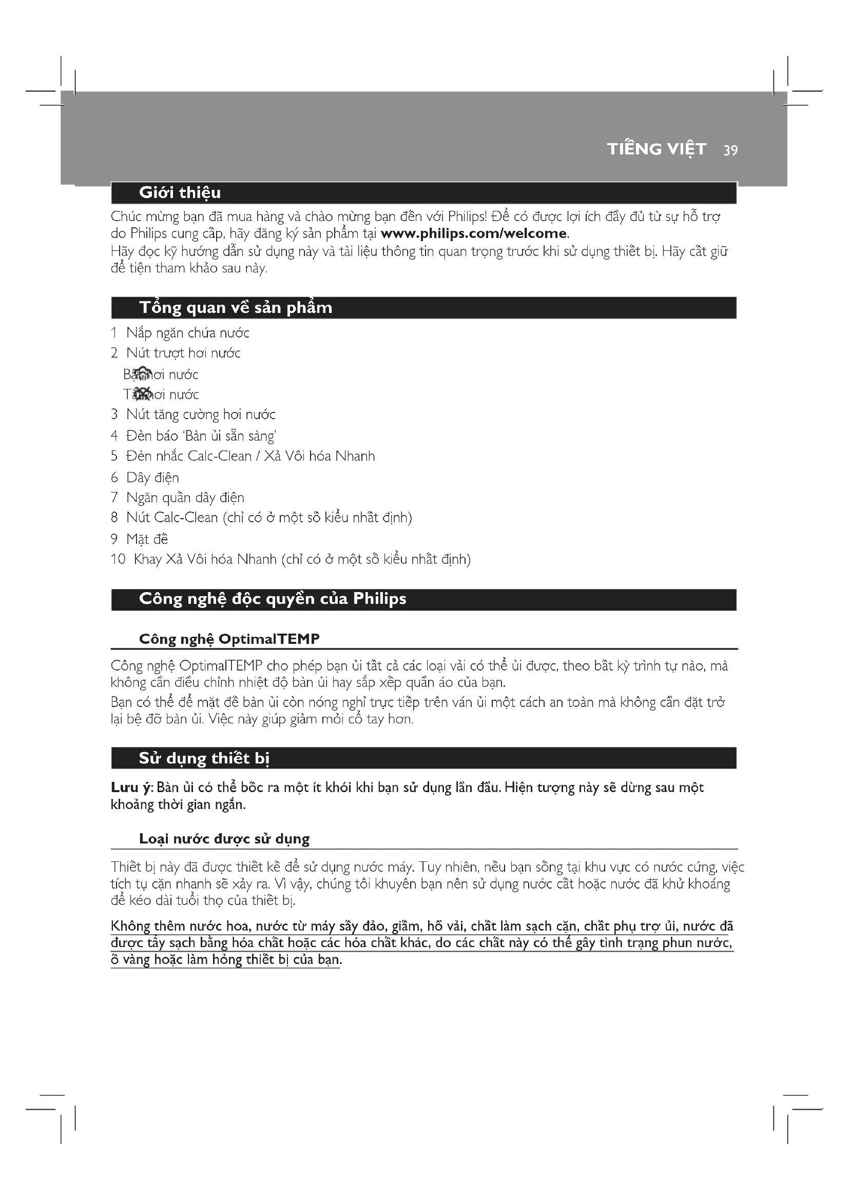 Gii thiu Chúc mừng bạn đ mua hng v cho mừng bạn đến với Philips! Để có được lợi ích đầy đủ từ sự hỗ trợ do Philips cung cấp, hy đăng kýsản phẩm tại www.philips.com/welcome. Hy đọc kỹ hướng dẫn sử dụng ny v ti liệu thông tin quan trọng trước khi sử dụng thiết bị. Hy cất giữ để tiện tham khảo sau ny. Tổng quan về sản phẩm 1 Nắp ngăn chứa nước 2 Nút trượt hơi nước Bật hơi nước Tắt hơi nước 3 Nút tăng cường hơi nước 4 Đèn báo ‘Bn ủi sẵn sng’ 5 Đèn nhắc Calc-Clean / Xả Vôi hóa Nhanh 6 Dây điện 7 Ngăn quấn dây điện 8 Nút Calc-Clean (chỉ có ở một số kiểu nhất định) 9 Mặt đế 10 Khay Xả Vôi hóa Nhanh (chỉ có ở một số kiểu nhất định) Công ngh độc quyền của Philips Công ngh OptimalTEMP Công nghệOptimalTEMP cho phép bạn ủi tất cả các loại vải có thể ủi được, theo bất kỳ trình tự no, m không cần điều chỉnh nhiệt độ bn ủi hay sắp xếp quần áo của bạn. Bạn có thể để mặt đế bn ủi còn nóng nghỉ trực tiếp trên ván ủi một cách an ton m không cần đặt trở lại bệ đỡ bn ủi. Việc ny giúp giảm mỏi cổ tay hơn. S dng thiết bị Lưu ý: Bàn ủi c th bc ra mt t khi khi bn s dng ln đu. Hiện tượng nàysẽ dừng sau mt khoảng thời gian ngắn. Loại nưc được s dng Thiết bị ny đ được thiết kế để sử dụng nước máy. Tuy nhiên, nếu bạn sống tại khu vực có nước cứng, việc tích tụ cặn nhanh sẽ xảy ra. Vì vậy, chúng tôi khuyên bạn nên sử dụng nước cất hoặc nước đ khử khoáng để kéo di tuổi thọ của thiết bị. Không thêm nước hoa, nước từ máy sấy đảo, giấm, hồ vải, chất làm sch cn, chất ph trợ ủi, nước đã được tẩy sch bằng ha chất hoc các ha chất khác, do các chất này c th gây tình trng phun nước, vàng hoc làm hỏng thiết bị của bn.TIẾNG VIỆT