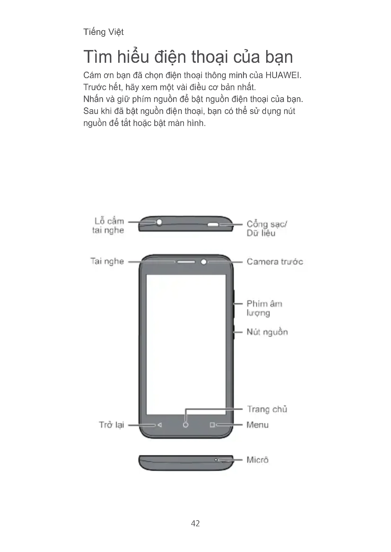 Tìm hiểu điện thoại của bạn Cám ơn bạn đã chọn điện thoại thông minh của HUAWEI. Trước hết, hãy xem một vài điều cơ bản nhất. Nhấn và giữ phím nguồn để bật nguồn điện thoại của bạn. Sau khi đã bật nguồn điện thoại, bạn có thể sử dụng nút nguồn để tắt hoặc bật màn hình.43 Chuẩn bị điện thoại Để lắp thẻ SIM, pin và thẻ microSD hãy thực hiện theo các bước được minh họa trong các hình sau đây. Điện thoại của bạn được cấp sẵn pin được sạc một phần. Khuyến cáo bạn nên sạc đầy pin trước khi sử dụng điện thoại lần đầu tiên.44 Thông Báo Pháp Lý Bản quyền © Huawei Technologies Co., Ltd. 2015. Bảo lưu mọi quyền. TÀI LIỆU NÀY CHỈ DÀNH CHO MỤC ĐÍCH THAM KHẢO, VÀ KHÔNG CHỨA ĐỰNG BẤT CỨ SỰ BẢO HÀNH NÀO. Chính sách Quyền riêng tư Vui lòng tham khảo chính sách quyền riêng tư trên các trang web của chúng tôi để có thông tin chi tiết về cách thức chúng tôi bảo vệ thông tin cá nhân. http://consumer.huawei.com/privacy-policy45 Thông tin an toàn Mục này chứa thông tin quan trọng về việc vận hành thiết bị của bạn. Nó cũng chứa thông tin về cách sử dụng thiết bị một cách an toàn. Hãy đọc kỹ thông tin này trước khi sử dụng thiết bị của bạn. Gây nhiễu thiết bị y tế