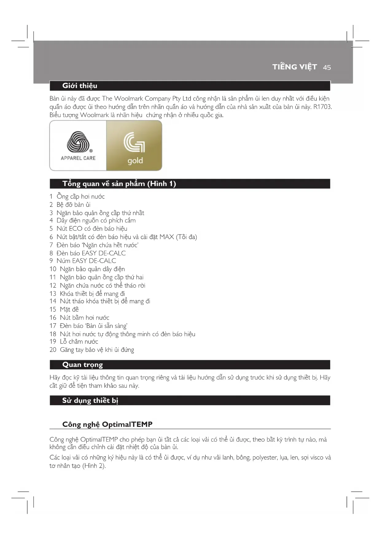 Gii thiu Bàn ủi này đã được The Woolmark Company Pty Ltd công nhận là sản phẩm ủi len duy nhất với điều kiện quần áo được ủi theo hướng dẫn trên nhãn quần áo và hướng dẫn của nhà sản xuất của bàn ủi này. R1703. Biểu tượng Woolmark là nhãn hiệu chứng nhận ở nhiều quốc gia. Tổng quan về sản phẩm (Hình 1) 1 Ống cấp hơi nước 2 Bệ đỡ bàn ủi 3 Ngăn bảo quản ống cấp thứ nhất 4 Dây điện nguồn có phích cắm 5 Nút ECO có đèn báo hiệu 6 Nút bật/tắt có đèn báo hiệu và cài đặt MAX (Tối đa) 7 Đèn báo ‘Ngăn chứa hết nước’ 8 Đèn báo EASY DE-CALC 9 Núm EASY DE-CALC 10 Ngăn bảo quản dây điện 11 Ngăn bảo quản ống cấp thứ hai 12 Ngăn chứa nước có thể tháo rời 13 Khóa thiết bị để mang đi 14 Nút tháo khóa thiết bị để mang đi 15 Mặt đế 16 Nút bấm hơi nước 17 Đèn báo ‘Bàn ủi sẵn sàng’ 18 Nút hơi nước tự động thông minh có đèn báo hiệu 19 Lỗ châm nước 20 Găng tay bảo vệ khi ủi đứng Quan trọng Hãy đọc kỹ tài liệu thông tin quan trọng riêng và tài liệu hướng dẫn sử dụng trước khi sử dụng thiết bị. Hãy cất giữ để tiện tham khảo sau này. Sử dụng thiết bị Công ngh OptimalTEMP Công nghệ OptimalTEMP cho phép bạn ủi tất cả các loại vải có thể ủi được, theo bất kỳ trình tự nào, mà không cần điều chỉnh cài đặt nhiệt độ của bàn ủi. Các loại vải có những ký hiệu này là có thể ủi được, ví dụ như vải lanh, bông, polyester, lụa, len, sợi visco và tơ nhân tạo (Hình 2).46