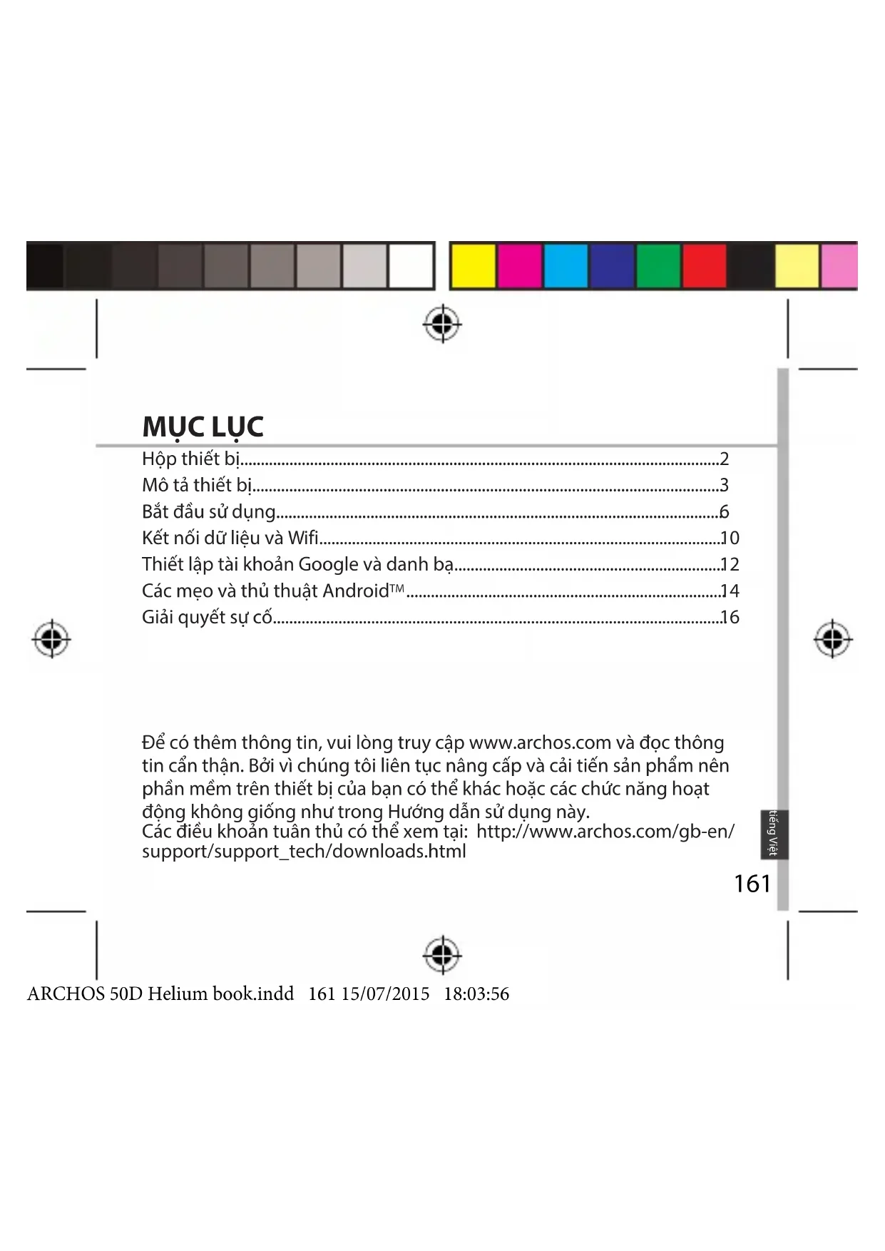által megadott pontos csatlakozási paramétereket. Hibaelhárítás ARCHOS 50D Helium book.indd 160 15/07/2015 18:03:56161 tiếng Việt Để có thêm thông tin, vui lòng truy cập www.archos.com và đọc thông tin cẩn thận. Bởi vì chúng tôi liên tục nâng cấp và cải tiến sản phẩm nên phần mềm trên thiết bị của bạn có thể khác hoặc các chức năng hoạt động không giống như trong Hướng dẫn sử dụng này. Các điều khoản tuân thủ có thể xem tại: http://www.archos.com/gb-en/ support/support_tech/downloads.html