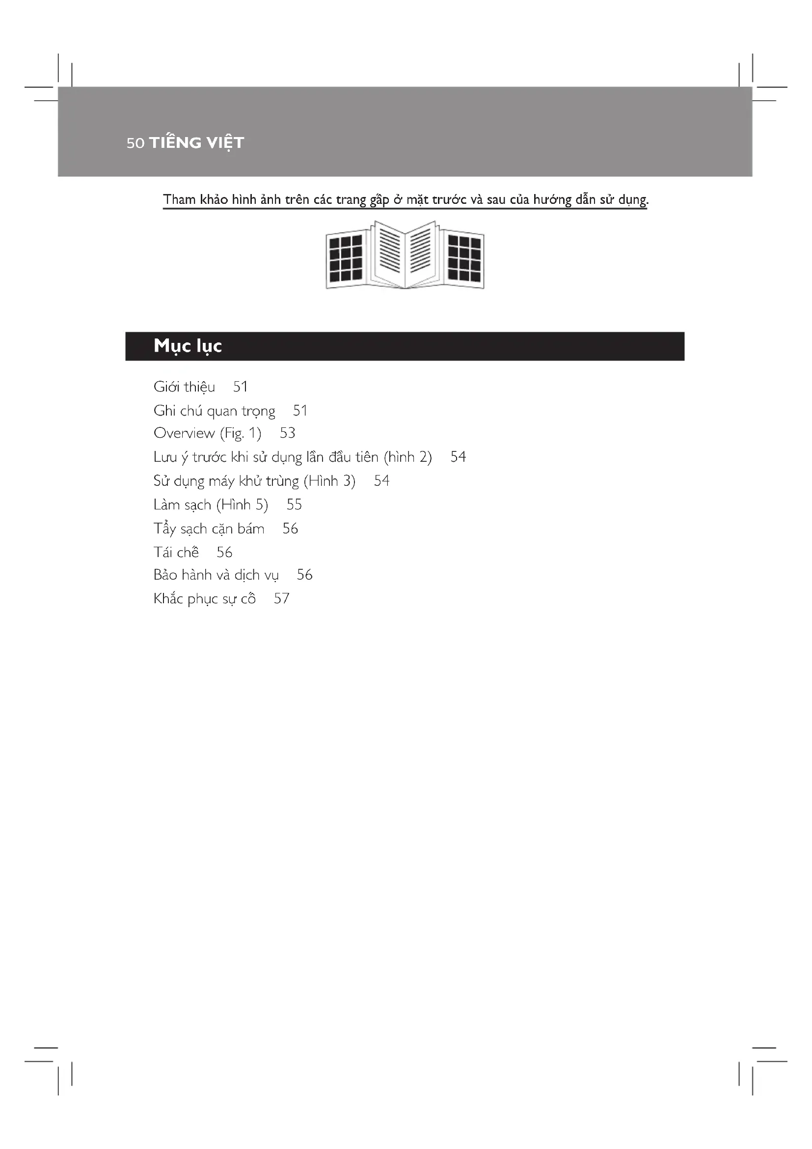 Mục lục Giới thiệu 51 Ghi chú quan trọng 51 Overview (Fig.1) 53 Lưu ý trước khi sử dụng lần đầu tiên (hình2) 54 Sử dụng máy khử trùng (Hình 3) 54 Làm sạch (Hình 5) 55 Tẩy sạch cặn bám 56 Tái chế 56 Bảo hành và dịch vụ 56 Khắc phục sự cố 57 Tham khảo hình ảnh trên các trang gấp ở mặt trước và sau của hướng dẫn sử dụng.51TIẾNG VIỆT Giới thiệu Chào mừng bạn đến với Philips Avent! Để chúng tôi có thể hỗ trợ bạn tốt nhất, hãy đăng ký sản phẩm tại www.philips.com/welcome. Ghi chú quan trọng Hãy đọc kỹ hướng dẫn sử dụng này trước khi sử dụng thiết bị và cất giữ để tiện tham khảo sau này. Nguy hiểm - Không nhúng đế, dây điện hoặc phích cắm vào trong nước hoặc bất kỳ chất lỏng nào khác. - Nếu không tuân thủ hướng dẫn vệ sinh cặn bám, thiết bị có thể bị hư hỏng không sửa được. - Không tháo đế để tránh bị điện giật. Cảnh báo - Trẻ em không được sử dụng thiết bị này. Để thiết bị và dây điện ngoài tầm với của trẻ em. - Người bị suy giảm năng lực thể chất hoặc trí lực chỉ có thể sử dụng thiết bị này nếu được giám sát và hướng dẫn đầy đủ để sử dụng thiết bị một cách an toàn. - Không để trẻ em chơi đùa với thiết bị. - Kiểm tra xem điện áp ghi trên thiết bị có tương ng với điện áp ngun nơi sử dụng trước khi nối thiết bị với ngun điện. - Chỉ nối thiết bị này vào cắm điện có dây tiếp đất và đảm bảo rng phích cắm được cắm chặt vào điện. Không để dây điện gần những bề mặt nóng. - Không sử dụng thiết bị nếu phích cắm, dây điện ngun hay chính thiết bị bị hư hỏng. - Nếu dây điện bị hỏng, bạn nên thay dây điện tại các trung tâm dịch vụ khách hàng do Philips Avent ủy quyền hoặc những cơ sở có uy tín để bảo đảm an toàn. - Bên trong đế nhiệt không cha bộ phận nào có thể tháo rời & thay thế, không được tự ý mở và chỉnh sửa thiết bị. - Thiết bị rất nóng khi đang vận hành và có thể gây bỏng nếu bạn chạm phải. - Hãy thận trọng với hơi nước nóng thoát ra từ lỗ thông hơi trên nắp hoặc khi bạn tháo nắp. Hơi nước có thể gây bỏng.52 TIẾNG VIỆT - Không được chạm vào đế, thân máy và nắp trong hoặc ngay sau khi thiết bị vừa vận hành xong để tránh bị bỏng. Chỉ sử dụng kẹp đính kèm để mở nắp. - Không di chuyển hoặc mở thiết bị khi thiết bị đang được sử dụng hoặc trước khi thiết bị nguội đi. - Không đặt các đ vật bên trên thiết bị khi thiết bị đang được sử dụng. - Chỉ sử dụng nước không có bất kỳ chất phụ trợ nào để khử trùng. Khuyến cáo nên sử dụng nước đã lọc để giảm cặn vôi. - Chỉ sử dụng giấm trắng theo hướng dẫn sử dụng để tẩy cặn. Không cho chất tẩy trắng hoặc các chất hóa học khác vào thiết bị. - Chỉ vệ sinh bình sữa và các vật dụng được ghi chú an toàn sử dụng trong máy tiệt trùng. Kiểm tra hướng dẫn sử dụng của các vật dùng này để đảm bảo có thể vệ sinh bng máy tiệt trùng hơi nước. - Để dừng giữa chừng trong tình huống khẩn cấp khi thiết bị đang hoạt động, hãy nhấn nút tắt ngun và rút phích cắm điện. Việc tiệt trùng trong khoảng thời gian ngắn hơn bình thường có thể ảnh hưởng đến mc độ vệ sinh. - Bề mặt của đế nhiệt thay đi theo nhiệt lượng còn lại sau khi sử dụng. Hãy cẩn thận để không bị đế nhiệt làm bỏng. - Thiết bị này được thiết kế chỉ để dùng trong gia đình. - Không sử dụng chất tẩy rửa mạnh hoặc có tính ăn mòn (ví dụ như chất tẩy trắng) hoặc miếng tẩy rửa để làm sạch thiết bị này. Chú ý - Không sử dụng linh kiện từ nhà sản xuất khác hoặc những phụ kiện Philips Avent không khuyên dùng. Trong những trường hợp này, thiết bị sẽ không còn giá trị bảo hành. - Thiết bị này được thiết kế để sử dụng trong nhà. Không để thiết bị gần ngun nhiệt quá nóng hoặc dưới ánh nắng mặt trời trực tiếp. - Luôn rút phích cắm và để thiết bị nguội đi trước khi dịch chuyển hoặc cất giữ. - Không tiệt trùng những vật dụng có kích thước quá nhỏ để tránh bị rơi xuống đế nhiệt qua các khe nhỏ của thân máy. - Không đặt trực tiếp các đ vật lên trên đế nhiệt khi thiết bị đã được khởi động.53TIẾNG VIỆT - Không sử dụng nếu máy bị rơi hoặc hư hỏng ở bất c bộ phận nào. Mang thiết bị sửa chữa tại các trung tâm bảo hành ủy quyền của Philips Avent. - Luôn đặt và sử dụng thiết bị trên bề mặt phẳng, nm ngang, khô ráo và chắc chắn. - Không đặt thiết bị trên bề mặt nóng. - Không để dây điện ngun treo trên cạnh bàn hoặc gần nơi đặt thiết bị. - Sau khi sử dụng, để máy nguội và đ hết nước còn dư. - Luôn rút phích cắm điện của máy ra sau khi sử dụng. - Điều kiện môi trường, chẳng hạn như độ cao trên 2500 mét so với mực nước biển, có thể ảnh hưởng đến hiệu suất khử trùng của thiết bị. - Tắt thiết bị và ngắt kết nối với ngun điện trư