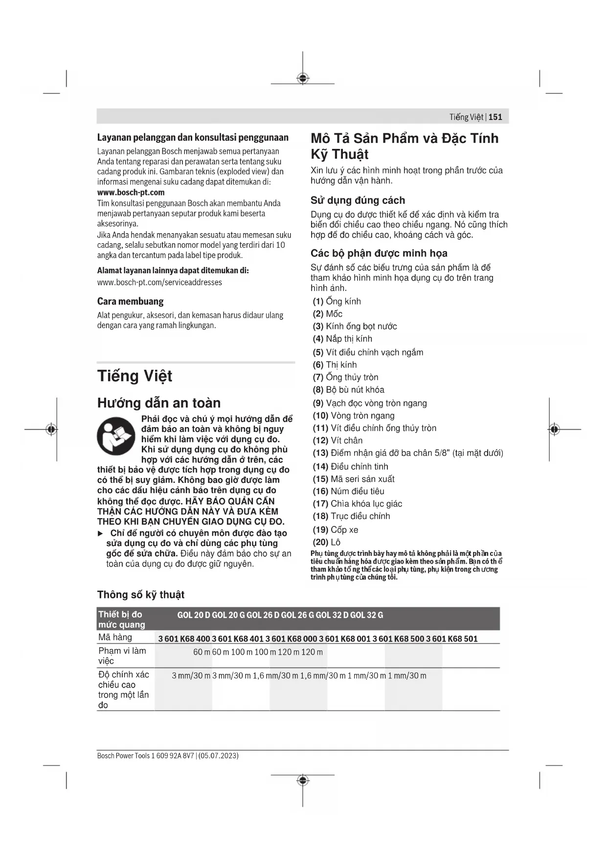 , nilai harus diatur sebesar 1.476m. Periksa lagi tanda bidik. Bila perlu, ulangi proses penyetelan atau hubungi juga layanan pelanggan Bosch. Perawatan dan servis Perawatan dan pembersihan Simpan dan angkut alat ukur hanya di dalam kotak penyimpan yang disediakan. Jaga kebersihan alat. Jangan memasukkan alat pengukur ke dalam air atau cairan lainnya. Jika alat kotor, bersihkan dengan lap yang lembut dan lembap. Jangan gunakan bahan pembersih atau zat pelarut. Gunakan lensa dengan sangat hati-hati. Bersihkan debu hanya dengan kuas yang lembut. Jangan sentuh lensa dengan jari. Biarkan alat ukur dan kotak penyimpan benar-benar dalam kondisi kering sebelum disimpan. Di dalam kotak penyimpan terdapat sebuah kantong berisi bahan pengering yang mengikat sisa kelembapan. Ganti kantong berisi bahan pengering secara berkala. Masukkan alat ukur di dalam kotak penyimpan jika alat hendak diperbaiki. 1 609 92A 8V7 | (05.07.2023) Bosch Power ToolsTiếng Việt | 151 Layanan pelanggan dan konsultasi penggunaan Layanan pelanggan Bosch menjawab semua pertanyaan Anda tentang reparasi dan perawatan serta tentang suku cadang produk ini. Gambaran teknis (exploded view) dan informasi mengenai suku cadang dapat ditemukan di: www.bosch-pt.com Tim konsultasi penggunaan Bosch akan membantu Anda menjawab pertanyaan seputar produk kami beserta aksesorinya. Jika Anda hendak menanyakan sesuatu atau memesan suku cadang, selalu sebutkan nomor model yang terdiri dari 10 angka dan tercantum pada label tipe produk. Alamat layanan lainnya dapat ditemukan di: www.bosch-pt.com/serviceaddresses Cara membuang Alat pengukur, aksesori, dan kemasan harus didaur ulang dengan cara yang ramah lingkungan. Tiếng Việt Hướng dẫn an toàn Phải đọc và chú ý mọi hướng dẫn để đảm bảo an toàn và không bị nguy hiểm khi làm việc với dụng cụ đo. Khi sử dụng dụng cụ đo không phù hợp với các hướng dẫn ở trên, các thiết bị bảo vệ được tích hợp trong dụng cụ đo có thể bị suy giảm. Không bao giờ được làm cho các dấu hiệu cảnh báo trên dụng cụ đo không thể đọc được. HÃY BẢO QUẢN CẨN THẬN CÁC HƯỚNG DẪN NÀY VÀ ĐƯA KÈM THEO KHI BẠN CHUYỂN GIAO DỤNG CỤ ĐO. u Chỉ để người có chuyên môn được đào tạo sửa dụng cụ đo và chỉ dùng các phụ tùng gốc để sửa chữa. Điều này đảm bảo cho sự an toàn của dụng cụ đo được giữ nguyên. Mô Tả Sản Phẩm và Đặc Tính Kỹ Thuật Xin lưu ý các hình minh hoạt trong phần trước của hướng dẫn vận hành. Sử dụng đúng cách Dụng cụ đo được thiết kế để xác định và kiểm tra biến đổi chiều cao theo chiều ngang. Nó cũng thích hợp để đo chiều cao, khoảng cách và góc. Các bộ phận được minh họa Sự đánh số các biểu trưng của sản phẩm là để tham khảo hình minh họa dụng cụ đo trên trang hình ảnh. (1) Ống kính (2) Mốc (3) Kính ống bọt nước (4) Nắp thị kính (5) Vít điều chỉnh vạch ngắm (6) Thị kính (7) Ống thủy tròn (8) Bộ bù nút khóa (9) Vạch đọc vòng tròn ngang (10) Vòng tròn ngang (11) Vít điều chỉnh ống thủy tròn (12) Vít chân (13) Điểm nhận giá đỡ ba chân 5/8" (tại mặt dưới) (14) Điều chỉnh tinh (15) Mã seri sản xuất (16) Núm điều tiêu (17) Chìa khóa lục giác (18) Trục điều chỉnh (19) Cốp xe (20) Lô
