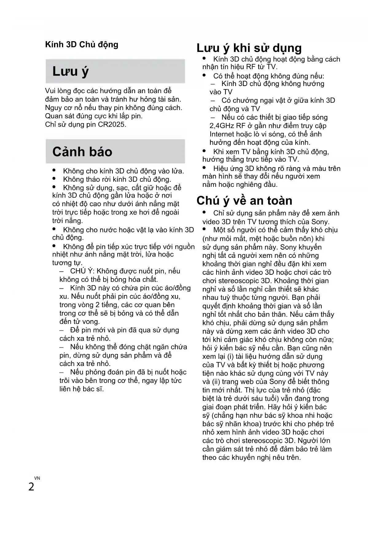Kính 3D Chủ động Lưu ý Vui lòng đọc các hướng dẫn an toàn để đảm bảo an toàn và tránh hư hỏng tài sản. Nguy cơ nổ nếu thay pin không đúng cách. Quan sát đúng cực khi lắp pin. Chỉ sử dụng pin CR2025. Cnh bo ˎ Không cho kính 3D chủ động vào lửa. ˎ Không tháo rời kính 3D chủ động. ˎ Không sử dụng, sạc, cất giữ hoặc để kính 3D chủ động gần lửa hoặc ở nơi có nhiệt độ cao như dưới ánh nắng mặt trời trực tiếp hoặc trong xe hơi để ngoài trời nắng. ˎ Không cho nước hoặc vật lạ vào kính 3D chủ động. ˎ Không để pin tiếp xúc trực tiếp với nguồn nhiệt như ánh nắng mặt trời, lửa hoặc tương tự. ˋ CHÚ Ý: Không được nuốt pin, nếu không có thể bị bỏng hóa chất. ˋ Kính 3D này có chứa pin cúc áo/đồng xu. Nếu nuốt phải pin cúc áo/đồng xu, trong vòng 2 tiếng, các cơ quan bên trong cơ thể sẽ bị bỏng và có thể dẫn đến tử vong. ˋ Để pin mới và pin đã qua sử dụng cách xa trẻ nhỏ. ˋ Nếu không thể đóng chặt ngăn chứa pin, dừng sử dụng sản phẩm và để cách xa trẻ nhỏ. ˋ Nếu phỏng đoán pin đã bị nuốt hoặc trôi vào bên trong cơ thể, ngay lập tức liên hệ bác sĩ. Lưu ý khi sử dụng ˎ Kính 3D chủ động hoạt động bằng cách nhận tín hiệu RF từ TV. ˎ Có thể hoạt động không đúng nếu: ˋ Kính 3D chủ động không hướng vào TV ˋ Có chướng ngại vật ở giữa kính 3D chủ động và TV ˋ Nếu có các thiết bị giao tiếp sóng 2,4GHz RF ở gần như điểm truy cập Internet hoặc lò vi sóng, có thể ảnh hưởng đến hoạt động của kính. ˎ Khi xem TV bằng kính 3D chủ động, hướng thẳng trực tiếp vào TV. ˎ Hiệu ứng 3D không rõ ràng và màu trên màn hình sẽ thay đổi nếu người xem nằm hoặc nghiêng đầu. Chú ý về an toàn ˎ Chỉ sử dụng sản phẩm này để xem ảnh video 3D trên TV tương thích của Sony. ˎ Một số người có thể cảm thấy khó chịu (như mỏi mắt, mệt hoặc buồn nôn) khi sử dụng sản phẩm này. Sony khuyến nghị tất cả người xem nên có những khoảng thời gian nghỉ đu đặn khi xem các hình ảnh video 3D hoặc chơi các trò chơi stereoscopic 3D. Khoảng thời gian nghỉ và số lần nghỉ cần thiết sẽ khác nhau tu thuộc từng người. Bạn phải quyết định khoảng thời gian và số lần nghỉ tốt nhất cho bản thân. Nếu cảm thấy khó chịu, phải dừng sử dụng sản phẩm này và dừng xem các ảnh video 3D cho tới khi cảm giác khó chịu không còn nữa; hỏi kiến bác s nếu cần. Bạn cng nên xem lại (i) tài liệu hướng dẫn sử dụng của TV và bất k thiết bị hoặc phương tiện nào khác sử dụng cng với TV này và (ii) trang web của Sony để biết thông tin mới nhất. Thị lực của trẻ nhỏ (đặc biệt là trẻ dưới sáu tuổi) vẫn đang trong giai đoạn phát triển. Hãy hỏi kiến bác s (chẳng hạn như bác s khoa nhi hoặc bác s nhãn khoa) trước khi cho php trẻ nhỏ xem hình ảnh video 3D hoặc chơi các trò chơi stereoscopic 3D. Người lớn cần giám sát trẻ nhỏ để đảm bảo trẻ làm theo các khuyến nghị nêu trên.3