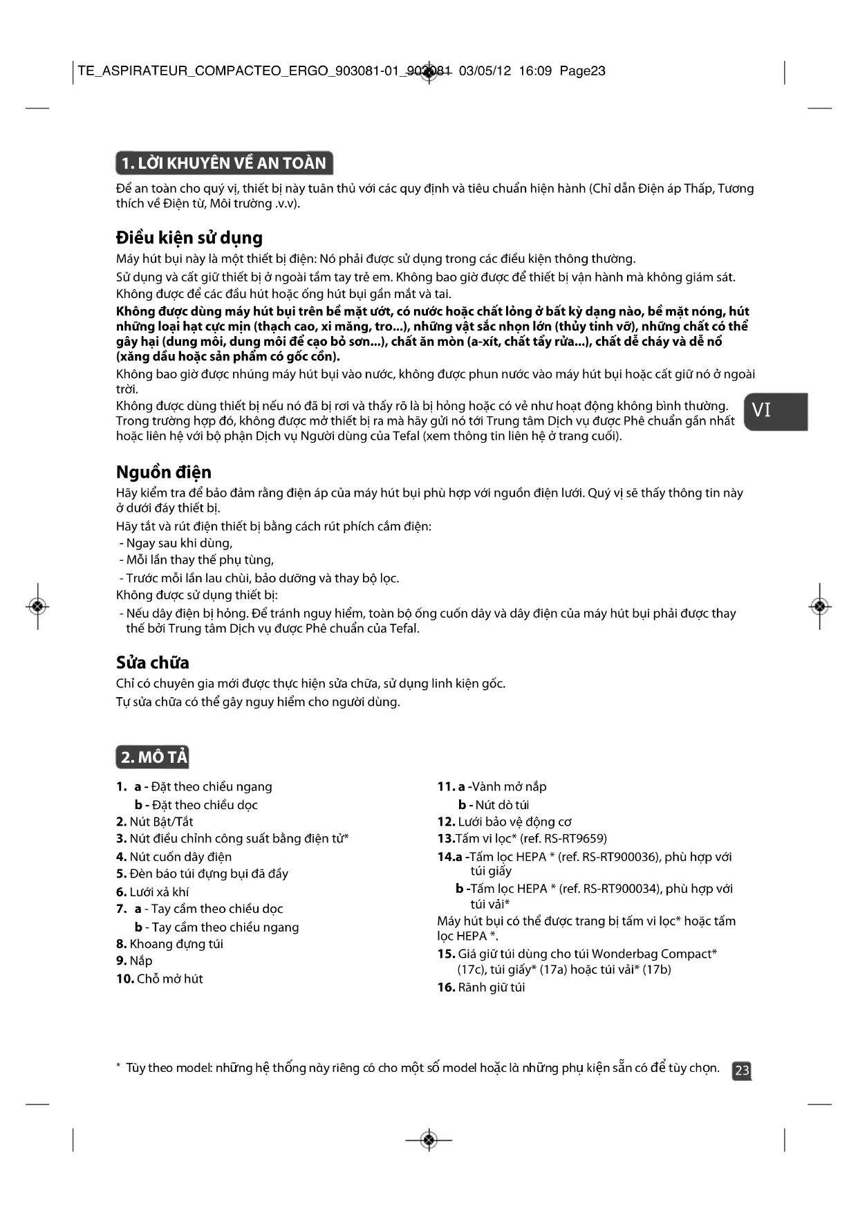 - Tùy theo model: những hệ thống này riêng có cho một số model hoặc là những phụ kiện sẵn có để tùy chọn. TE_ASPIRATEUR_COMPACTEO_ERGO_903081-01_903081 03/05/12 16:09 Page2324 Mở hộp đựng Mở hộp đựng thiết bị, giữ lại thẻ bảo hành và đọc kỹ hướng dẫn sử dụng trước khi sử dụng máy hút bụi này lần đầu tiên. Lời khuyên và thận trọng Trước mỗi lần dùng, phải kéo toàn bộ dây điện ra. Bảo đảm rằng dây không bị tắc hoặc cọ sát vào những vật sắc nhọn. Nếu bạn dùng ổ dây nối dài, hãy bảo đảm rằng ổ dây đó có tình trạng tốt và phù hợp với điện áp của máy hút bụi. Máy hút bụi được gắn một thiết bị để bảo vệ động cơ khỏi bị quá nóng. Trong một số trường hợp (sử dụng ống hút mềm trên ghế v.v.), thiết bị này sẽ được kích khởi và máy hút bụi có thể phát ra tiếng kêu khác thường. Điều này không gây ra hậu quả gì. Không được di chuyển máy hút bụi bằng cách kéo sợi dây điện. Hãy xách tay cầm khi di chuyển máy hút bụi. Không được déo sợi dây điện để nâng máy hút bụi lên. Không bao giờ được rút điện máy hút bụi bằng cách kéo sợi dây điện. Không bao giờ được vận hành máy mà không có túi đựng bụi và hệ thống lọc: tấm vi lọc* và tấm lọc HEPA*. Hãy bảo đảm rằng bộ lọc (13 hoặc 14a và 14b) được gắn chắc chắn vào đúng chỗ. Chỉ sử dụng bộ lọc và túi Tefal nguyên bản. Chỉ sử dụng các phụ kiện Tefal nguyên bản. Nếu bạn gặp khó khăn khi kiếm các phụ kiện và bộ lọc cho máy hút bụi này, hãy liên hệ với bộ phận dịch vụ khách hàng của Tefal. Tắt máy và rút điện sau mỗi lần dùng. Luôn luôn tắt máy và rút điện trước khi bảo dưỡng hoặc lau chùi. Thiết bị này không đươc thiêt kê đê sư dung bơi nhưng ngươi (kê ca tre em) bi suy giảm khả năng về thể chất, giác quan hoặc tâm thần, hoặc thiếu kinh nghiệm và kiến thức, trừ khi họ đa được người chịu trách nhiệm về sự an toàn của họ giam sat hoăc chỉ dẫn trươc về việc sử dụng thiết bị này. Trẻ em phải được giám sát để bảo đảm rằng chúng không nghịch thiết bị. Lắp ráp các bộ phận của máy hút bụi Đẩy ống hút linh hoạt (18) chặt vào chỗ mở hút (10) và xoay cho đến khi chốt chặt - hình.1. Để tháo ra, hãy xoay theo chiều ngược lại và kéo ra - hình.2. Nếu máy hút bụi được trang bị ống lồng * (19): đẩy núm điều chỉnh về phía trước, kéo ra độ dài ống mong muốn và nhả núm ra để chốt lại – hình. 3a. Nếu không, hãy lắp hai ống * (20), xoay nhẹ – hình 3b. Lắp phụ kiện mong muốn vào cuối ống: - Đối với thảm trải sàn và thảm tấm: Dùng đầu hút mọi loại sàn (22) với bàn chải ở vị trí thụt vào – hình. 4.