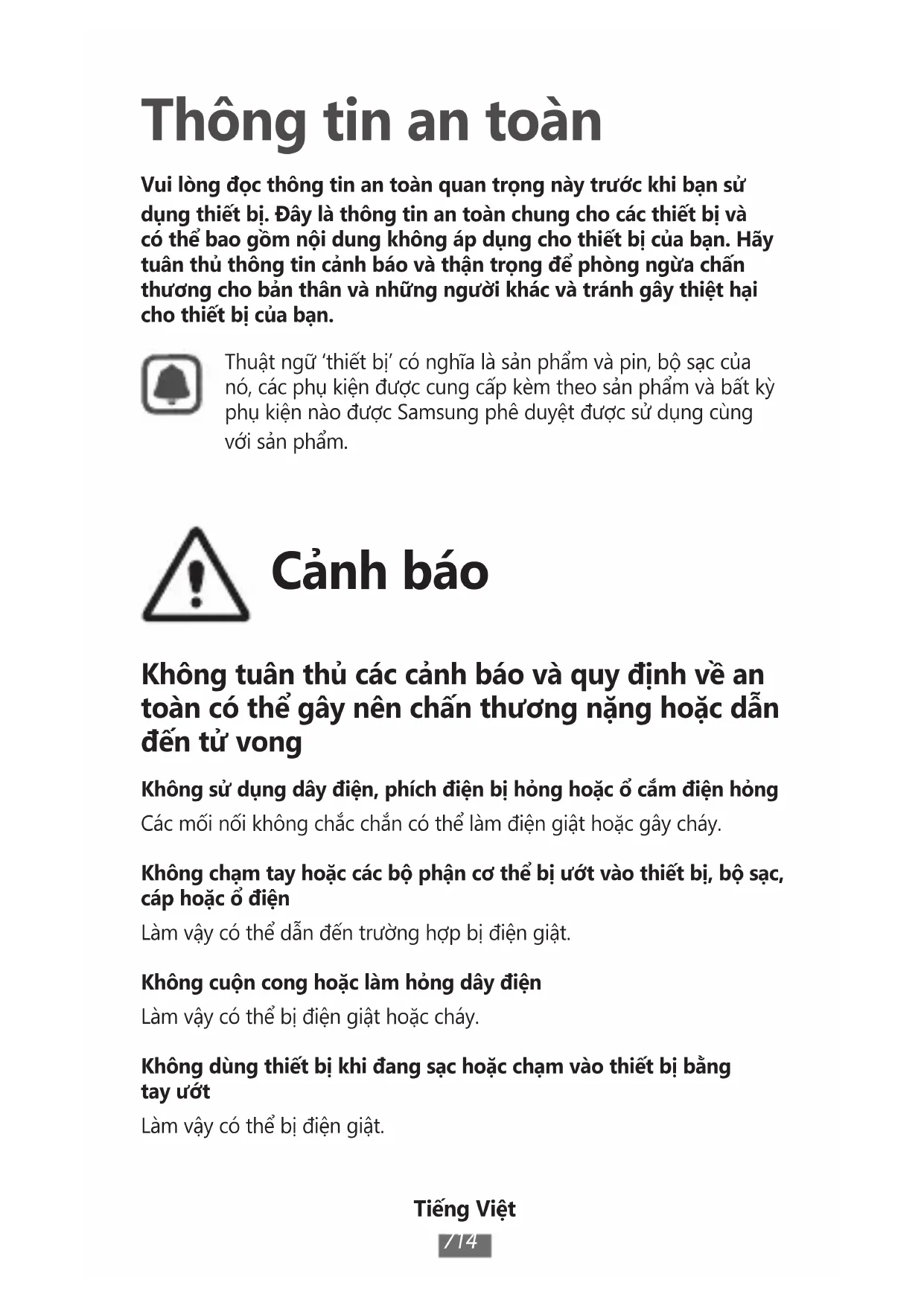 Thông tin an toàn Vui lòng đọc thông tin an toàn quan trọng này trước khi bạn sử dụng thiết bị. Đây là thông tin an toàn chung cho các thiết bị và có thể bao gồm nội dung không áp dụng cho thiết bị của bạn. Hãy tuân thủ thông tin cảnh báo và thận trọng để phòng ngừa chấn thương cho bản thân và những người khác và tránh gây thiệt hại cho thiết bị của bạn.Thuật ngữ ‘thiết bị’ có nghĩa là sản phẩm và pin, bộ sạc của nó, các phụ kiện được cung cấp kèm theo sản phẩm và bất kỳ phụ kiện nào được Samsung phê duyệt được sử dụng cùng với sản phẩm. Cảnh báo Không tuân thủ các cảnh báo và quy định về an toàn có thể gây nên chấn thương nặng hoặc dẫn đến tử vong Không sử dụng dây điện, phích điện bị hỏng hoặc ổ cắm điện hỏngCác mối nối không chắc chắn có thể làm điện giật hoặc gây cháy.Không chạm tay hoặc các bộ phận cơ thể bị ướt vào thiết bị, bộ sạc, cáp hoặc ổ điệnLàm vậy có thể dẫn đến trường hợp bị điện giật.Không cuộn cong hoặc làm hỏng dây điệnLàm vậy có thể bị điện giật hoặc cháy.Không dùng thiết bị khi đang sạc hoặc chạm vào thiết bị bằng tay ướtLàm vậy có thể bị điện giật.Tiếng Việt