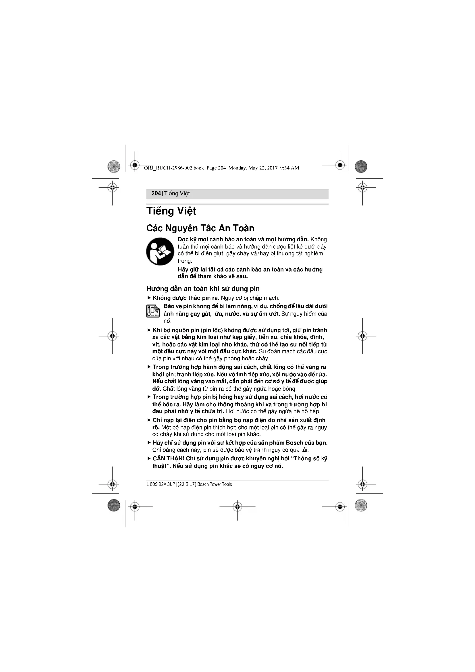 - Một số thiết bị USB bên ngoài không thể được sạc pin bằng bộ thích nghi pin mặc dù đã thỏa mãn các thông số kỹ thuật. Vấn đề Giải quyết Biện pháp Chỉnh Sửa OBJ_BUCH-2986-002.book Page 208 Monday, May 22, 2017 9:34 AMTiếng Việt | 209 Bosch Power Tools 1 609 92A 3UP | (22.5.17) Campuchia Công ty TNHH Robert Bosch (Campuchia) Đơn nguyên 8BC, GT Tower, Tầng 08, Đường 169, TiệpKhắc Blvd, Sangkat Veal Vong, Khan 7 Makara, Phnom Penh VAT TIN : 100 169 511 Tel.: +855 23 900 685 Tel.: +855 23 900 660 www.bosch.com.kh Vận Chuyển Pin có chứa lithium-ion là đối tượng phải tuân theo các qui định của Pháp Luật về Hàng Hóa Nguy Hiểm. Người sử dụng có thể vận chuyển pin bằng đường bộ mà không cần có thêm yêu cầu nào khác. Khi được vận chuyển thông qua bên thứ ba (vd. vận chuyển bằng đường hàng không hay đại lý giao nhận), phải tuân theo các yêu cầu đặc biệt về đóng gói và dán nhãn. Để chuẩn bị cho món hàng sẽ được gửi đi, cần tham khảo ý kiến của chuyên gia về vật liệu ngu y hiểm. Chỉ gửi pin đi khi vỏ ngoài không bị hư hỏng. Dán băng keo hay che kín các điểm tiếp xúc để hở và đóng gói pin cách sao cho pin không thể xê dịch khi nằm trong bao bì được. Cũng xin vui lòng tuân theo qui định chi tiết có thể có của mỗi quốc gia. Thải bỏ Bộ thích ứng pin, pin, phụ kiện và bao bì cần được tái sử dụng phù hợp với môi trường. Bạn không được ném bộ thích ứng pin và pin/pin sạc vào thùng rác gia đình! Pin lốc/pin: Li-ion: Xin vui lòng tuân thủ theo thông tin dưới đây “Vận Chuyển”, trang 209. Được quyền thay đổi nội dung mà không phải thông báo trước. OBJ_BUCH-2986-002.book Page 209 Monday, May 22, 2017 9:34 AM210 | 1 609 92A 3UP | (22.5.17) Bosch Power Tools