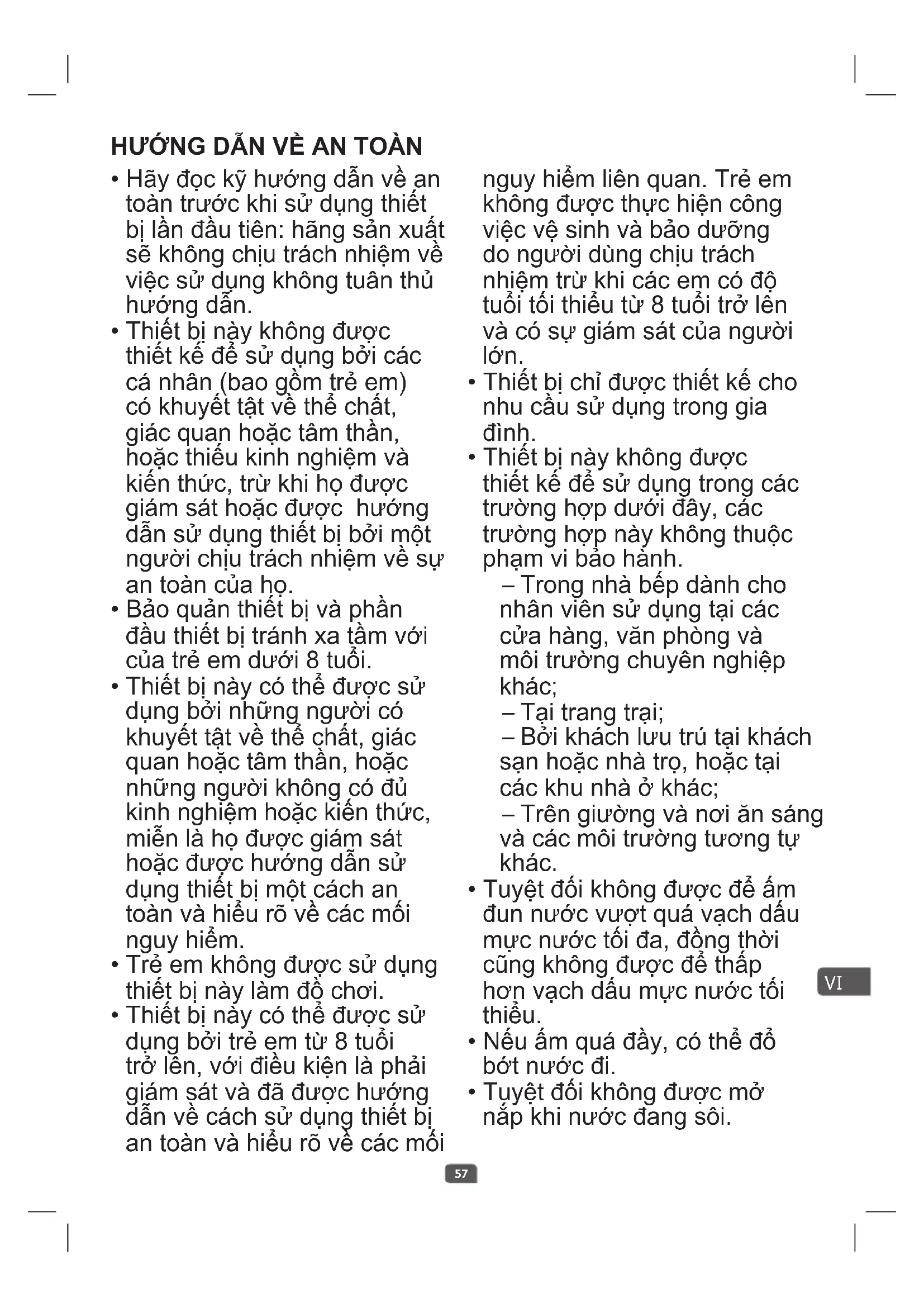 - Thiết bị này có thể được sử dụng bởi trẻ em từ 8 tuổi trở lên, với điều kiện là phải giám sát và đã được hướng dẫn về cách sử dụng thiết bị an toàn và hiểu rõ về các mối nguy hiểm liên quan. Trẻ em không được thực hiện công việc vệ sinh và bảo dưỡng do người dùng chịu trách nhiệm trừ khi các em có độ tuổi tối thiểu từ 8 tuổi trở lên và có sự giám sát của người lớn.