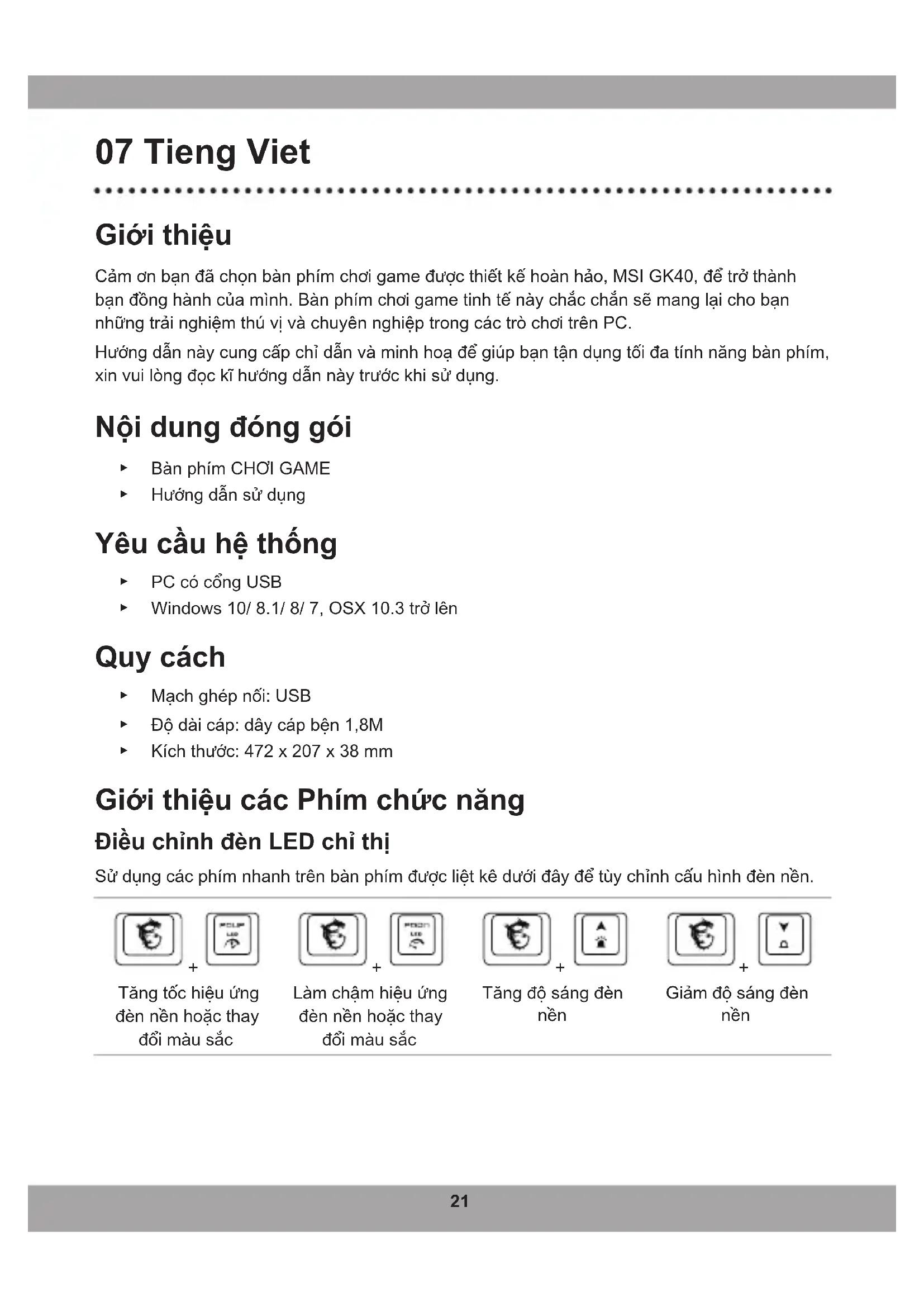 - Tekan + atau untuk menyesuaikan rona warna. Referensi: Anti-ghosting Tab+Caps+Shift+Ctrl+Q+W+E+R+T+A+S+D+F+G+Z+X+C+V+B+Space 20 Tombol Q+W+E+R+T+Y+U+I+O+P+Space 11 Tombol A+S+D+F+G+H+J+K+L+; +Space 11 Tombol Z+X+C+V+B+N+M+,+.+/+Backspace 11 Tombol TAB+CAPS+Shift+Ctrl+Alt+Q+W+E+A+S+D+Z+X+C 14 Tombol TAB+CAPS+Shift+Ctrl+Space+Q+W+E+A+S+D+F+G+Z+X+C+↑+←+↓+→ 20 Tombol Shift-L+Shift-R+Ctrl-L+Ctrl-R+Alt-L+Alt-R+Space+↑+←+↓+→ 11 Tombol A+S+D+F+J+K+L+;+Backspace 9 Tombol21 07 Tieng Viet Giới thiệu Cảmơnbạnđãchọnbànphímchơigameđượcthiếtkếhoànhảo,MSIGK40,đểtrởthành bạnđồnghànhcủamình.Bànphímchơigametinhtếnàychắcchắnsẽmanglạichobạn nhữngtrảinghiệmthúvịvàchuyênnghiệptrongcáctròchơitrênPC. Hướngdẫnnàycungcấpchỉdẫnvàminhhoạđểgiúpbạntậndụngtốiđatínhnăngbànphím, xinvuilòngđọckĩhướngdẫnnàytrướckhisửdụng. Nội dung đóng gói ▶ BànphímCHƠIGAME ▶ Hướngdẫnsửdụng Yêu cầu hệ thống ▶ PCcócổngUSB ▶ Windows10/8.1/8/7,OSX10.3trởlên Quy cách ▶ Mạchghépnối:USB ▶ Độdàicáp:dâycápbện1,8M ▶ Kíchthước:472x207x38mm Giới thiệu các Phím chức năng Điều chỉnh đèn LED chỉ thị Sửdụngcácphímnhanhtrênbànphímđượcliệtkêdướiđâyđểtùychỉnhcấuhìnhđènnền.