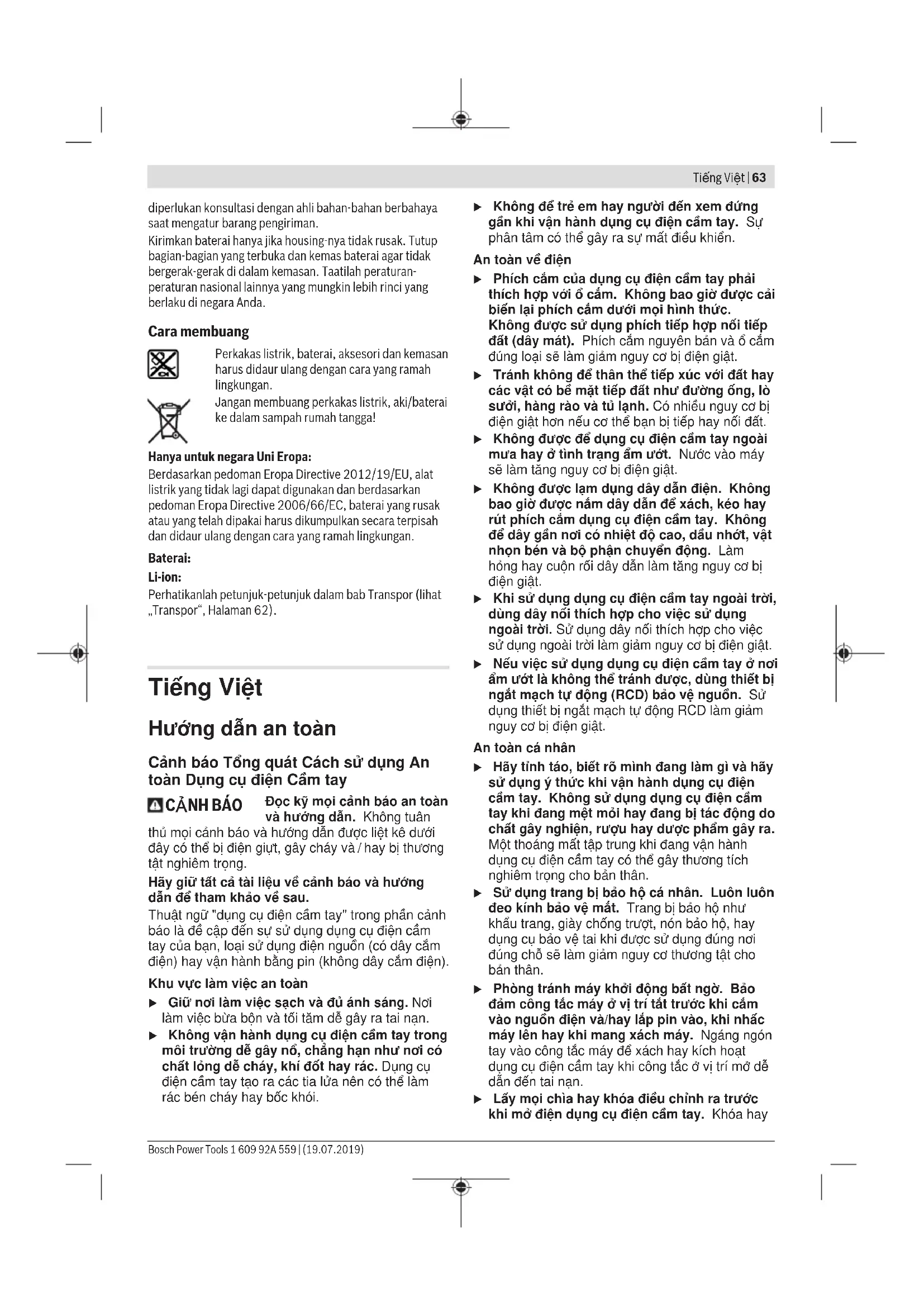 Đọc kỹ mọi cảnh báo an toàn và hướng dẫn. Không tuân thủ mọi cảnh báo và hướng dẫn được liệt kê dưới đây có thể bị điện giựt, gây cháy và / hay bị thương tật nghiêm trọng. Hãy giữ tất cả tài liệu về cảnh báo và hướng dẫn để tham khảo về sau. Thuật ngữ "dụng cụ điện cầm tay" trong phần cảnh báo là đề cập đến sự sử dụng dụng cụ điện cầm tay của bạn, loại sử dụng điện nguồn (có dây cắm điện) hay vận hành bằng pin (không dây cắm điện). Khu vực làm việc an toàn u Giữ nơi làm việc sạch và đủ ánh sáng. Nơi làm việc bừa bộn và tối tăm dễ gây ra tai nạn. u Không vận hành dụng cụ điện cầm tay trong môi trường dễ gây nổ, chẳng hạn như nơi có chất lỏng dễ cháy, khí đốt hay rác. Dụng cụ điện cầm tay tạo ra các tia lửa nên có thể làm rác bén cháy hay bốc khói. u Không để trẻ em hay người đến xem đứng gần khi vận hành dụng cụ điện cầm tay. Sự phân tâm có thể gây ra sự mất điều khiển. An toàn về điện u Phích cắm của dụng cụ điện cầm tay phải thích hợp với ổ cắm. Không bao giờ được cải biến lại phích cắm dưới mọi hình thức. Không được sử dụng phích tiếp hợp nối tiếp đất (dây mát). Phích cắm nguyên bản và ổ cắm đúng loại sẽ làm giảm nguy cơ bị điện giật. u Tránh không để thân thể tiếp xúc với đất hay các vật có bề mặt tiếp đất như đường ống, lò sưởi, hàng rào và tủ lạnh. Có nhiều nguy cơ bị điện giật hơn nếu cơ thể bạn bị tiếp hay nối đất. u Không được để dụng cụ điện cầm tay ngoài mưa hay ở tình trạng ẩm ướt. Nước vào máy sẽ làm tăng nguy cơ bị điện giật. u Không được lạm dụng dây dẫn điện. Không bao giờ được nắm dây dẫn để xách, kéo hay rút phích cắm dụng cụ điện cầm tay. Không để dây gần nơi có nhiệt độ cao, dầu nhớt, vật nhọn bén và bộ phận chuyển động. Làm hỏng hay cuộn rối dây dẫn làm tăng nguy cơ bị điện giật. u Khi sử dụng dụng cụ điện cầm tay ngoài trời, dùng dây nối thích hợp cho việc sử dụng ngoài trời. Sử dụng dây nối thích hợp cho việc sử dụng ngoài trời làm giảm nguy cơ bị điện giật. u Nếu việc sử dụng dụng cụ điện cầm tay ở nơi ẩm ướt là không thể tránh được, dùng thiết bị ngắt mạch tự động (RCD) bảo vệ nguồn. Sử dụng thiết bị ngắt mạch tự động RCD làm giảm nguy cơ bị điện giật. An toàn cá nhân u Hãy tỉnh táo, biết rõ mình đang làm gì và hãy sử dụng ý thức khi vận hành dụng cụ điện cầm tay. Không sử dụng dụng cụ điện cầm tay khi đang mệt mỏi hay đang bị tác động do chất gây nghiện, rượu hay dược phẩm gây ra. Một thoáng mất tập trung khi đang vận hành dụng cụ điện cầm tay có thể gây thương tích nghiêm trọng cho bản thân. u Sử dụng trang bị bảo hộ cá nhân. Luôn luôn đeo kính bảo vệ mắt. Trang bị bảo hộ như khẩu trang, giày chống trượt, nón bảo hộ, hay dụng cụ bảo vệ tai khi được sử dụng đúng nơi đúng chỗ sẽ làm giảm nguy cơ thương tật cho bản thân. u Phòng tránh máy khởi động bất ngờ. Bảo đảm công tắc máy ở vị trí tắt trước khi cắm vào nguồn điện và/hay lắp pin vào, khi nhấc máy lên hay khi mang xách máy. Ngáng ngón tay vào công tắc máy để xách hay kích hoạt dụng cụ điện cầm tay khi công tắc ở vị trí mở dễ dẫn đến tai nạn. u Lấy mọi chìa hay khóa điều chỉnh ra trước khi mở điện dụng cụ điện cầm tay. Khóa hay Bosch Power Tools 1 609 92A 559 | (19.07.2019)64 | Tiếng Việt chìa còn gắn dính vào bộ phận quay của dụng cụ điện cầm tay có thể gây thương tích cho bản thân. u Không rướn người. Luôn luôn giữ tư thế đứng thích hợp và thăng bằng. Điều này tạo cho việc điều khiển dụng cụ điện cầm tay tốt hơn trong mọi tình huống bất ngờ. u Trang phục thích hợp. Không mặc quần áo rộng lùng thùng hay mang trang sức. Giữ tóc, quần áo và găng tay xa khỏi các bộ phận chuyển động. Quần áo rộng lùng thùng, đồ trang sức hay tóc dài có thể bị cuốn vào các bộ phận chuyển động. u Nếu có các thiết bị đi kèm để nối máy hút bụi và các phụ kiện khác, bảo đảm các thiết bị này được nối và sử dụng tốt. Việc sử dụng các thiết bị gom hút bụi có thể làm giảm các độc hại liên quan đến bụi gây ra. Sử dụng và bảo dưỡng dụng cụ điện cầm tay u Không được ép máy. Sử dụng dụng cụ điện cầm tay đúng loại theo đúng ứng dụng của bạn. Dụng cụ điện cầm tay đúng chức năng sẽ làm việc tốt và an toàn hơn theo đúng tiến độ mà máy được thiết kế. u Không sử dụng dụng cụ điện cầm tay nếu như công tắc không tắt và mở được. Bất kỳ dụng cụ điện cầm tay nào mà không thể điều khiển được bằng công tắc là nguy hiểm và phải được sửa chữa. u Rút phích cắm ra khỏi nguồn điện và/hay pin ra khỏi dụng cụ điện cầm tay trước khi tiến hành bất kỳ điều chỉnh nào, thay phụ kiện, hay cất dụng cụ điện cầm tay. Các biện pháp ngăn