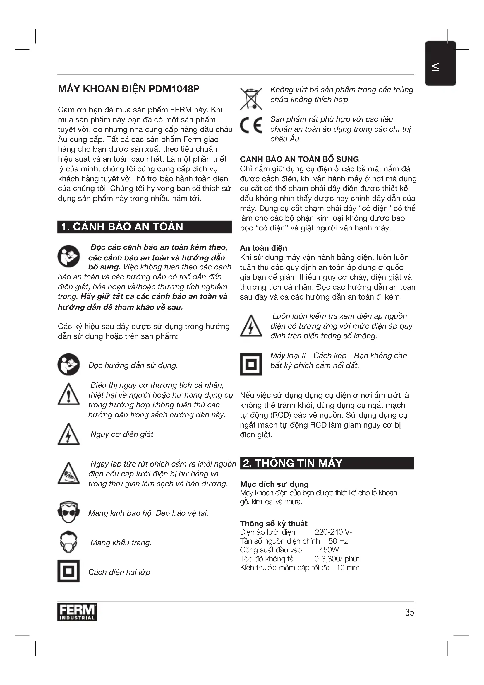 MÁY KHOAN ĐIỆN PDM1048P Cảm ơn bạn đã mua sản phẩm FERM này. Khi mua sản phẩm này bạn đã có một sản phẩm tuyệt vời, do những nhà cung cấp hàng đầu châu Âu cung cấp. Tất cả các sản phẩm Ferm giao hàng cho bạn được sản xuất theo tiêu chuẩn hiệu suất và an toàn cao nhất. Là một phần triết lý của mình, chúng tôi cũng cung cấp dịch vụ khách hàng tuyệt vời, hỗ trợ bảo hành toàn diện của chúng tôi. Chúng tôi hy vọng bạn sẽ thích sử dụng sản phẩm này trong nhiều năm tới.