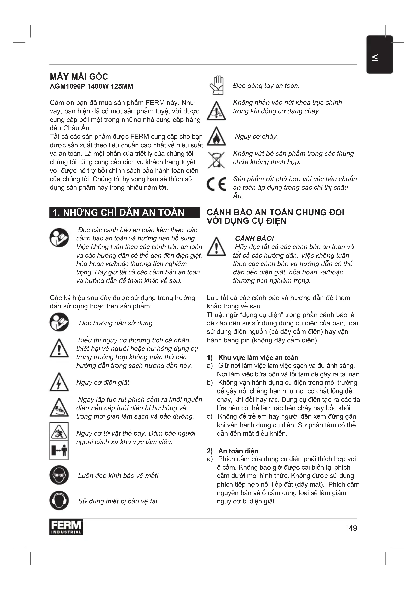 Các thiết bị điện, điện tử bị lỗi và/hoặc loại bỏ phải được thu gom tại các địa điểm tái chế thích hợp. Chỉ dành cho các nước Liên minh Châu Âu Không vứt bỏ dụng cụ điện cầm tay vào chất thải sinh hoạt. Theo Hướng dẫn của châu Âu 2012/19/ EU về chất thải từ các thiết bị điện và điện tử và thực hiện như quyền lợi quốc gia, các dụng cụ điện không còn sử dụng phải được thu gom riêng biệt và được xử lý một cách thân thiện với môi trường. Sản phẩm và hướng dẫn sử dụng có thể được thay đổi. Thông số kỹ thuật có thể thay đổi mà không cần thông báo thêm.156 Spare parts list AGM1096P Article no. Description Position no. 410234 Handle complete 3|7|8 410235 Carbon brush cover set (2pcs) 10 410236 Carbon brush set (2pcs) 11 410237 Carbon brush holder set (2pcs) 12|13 410238 Stator 17 410239 Wind ring 19 410240 Rear rotor bearing + sleeve 20|21 410241 Rotor 22|23 410242 Ball bearing 6200 26 410243 Pinion gear 27 410244 Spindle lock complete 30..33 410245 Ball bearing 626 37 410246 Spindle complete 37..45 410247 Guard 46 410248 Inner flange 47 410249 Outter flange 49 410250 Side handle 50 410251 Flange key157 Exploded view158159 EN 55014-1, EN 55014-2, EN 61000-3-2, EN 61000-3-3, EN 60745-1, EN 60745-2-3 2014/35/EC, 2006/95/EC, 2014/30/EC, 2011/65/EU,2012/19/EU Zwolle, 01-09-2020 H.G.F Rosberg CEO FERM FERM - Lingenstraat 6 - 8028 PM - Zwolle - The Netherlands (EN)